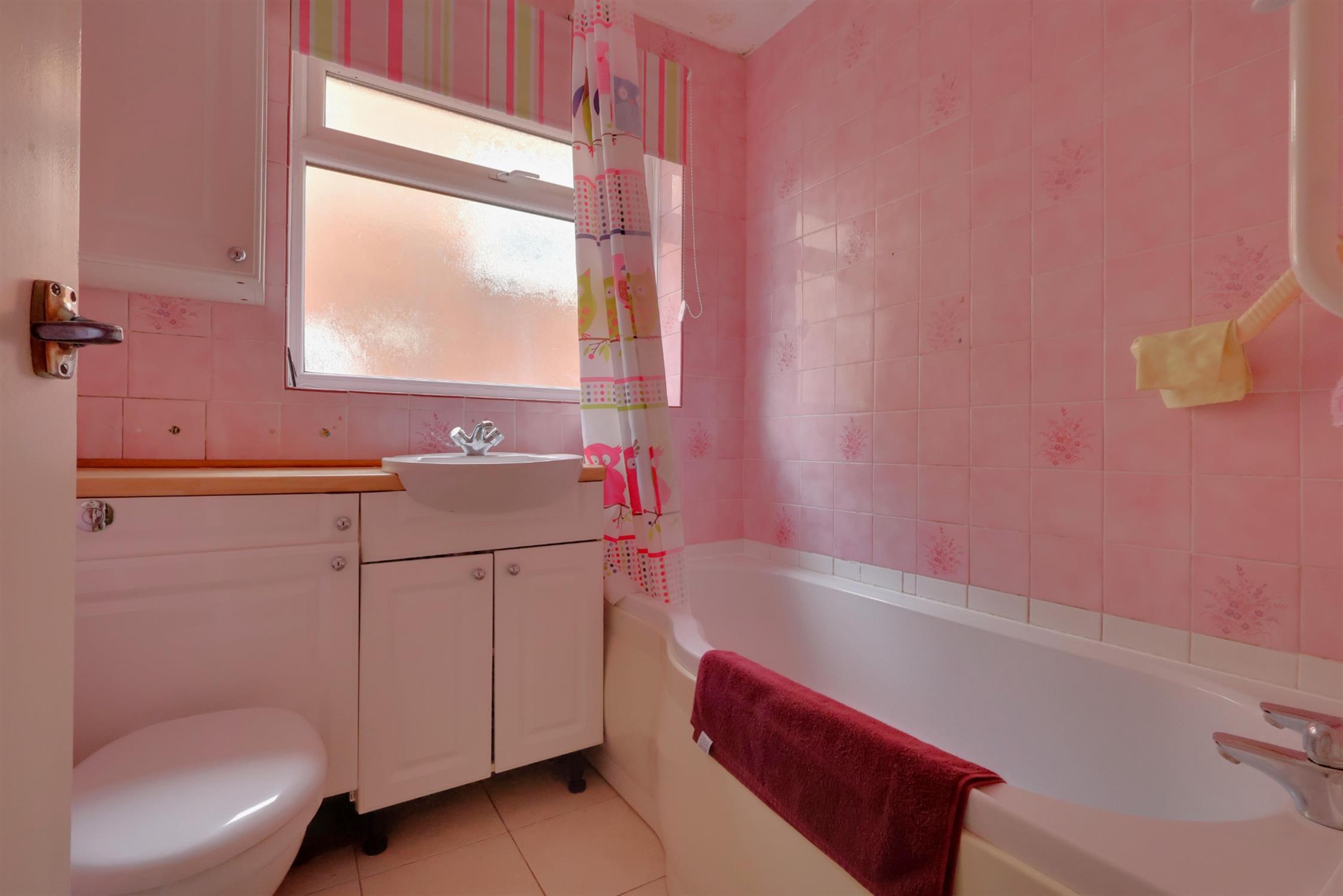 Obscured double glazed window to the side elevation, vanity unit with wash hand basin, low-level WC, panel-enclosed bath with shower over, tiled flooring and heated ladder-style radiator.