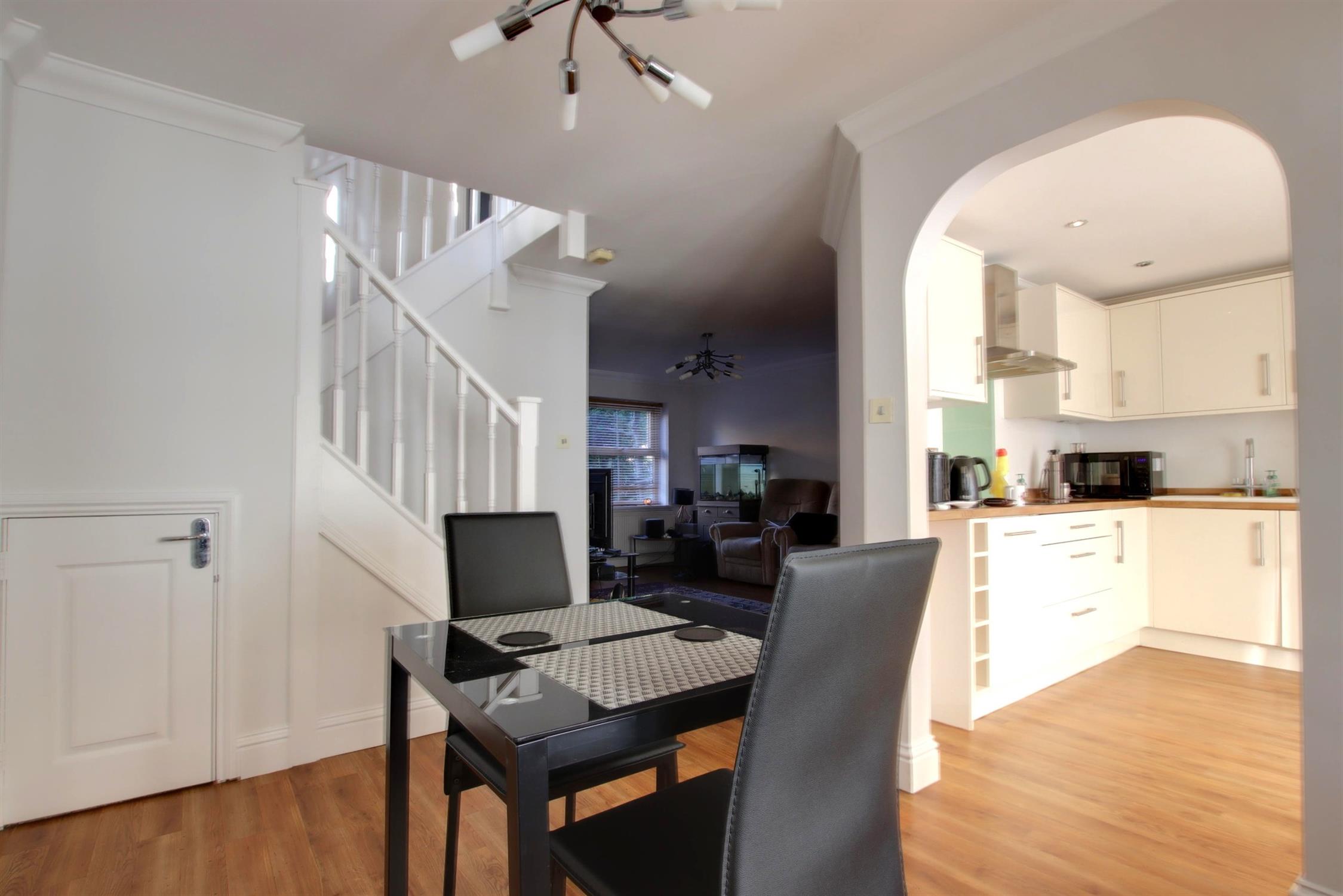 Double glazed door leading to the rear garden and double glazed window to the rear aspect. Part smooth and coved ceiling with inset spotlighting. Matching wall and base units with inset porcelain sink and half drainer. Four ring induction hob with glass splash back and extractor hood over. Fitted 'AEG' double oven. Integrated dishwasher and pull-out refuse bin for domestic waste and recycling. 'Samsung' American style fridge/freezer to remain. Radiator. Continuation of the wood effect 'Karndean' flooring from the lounge/diner.