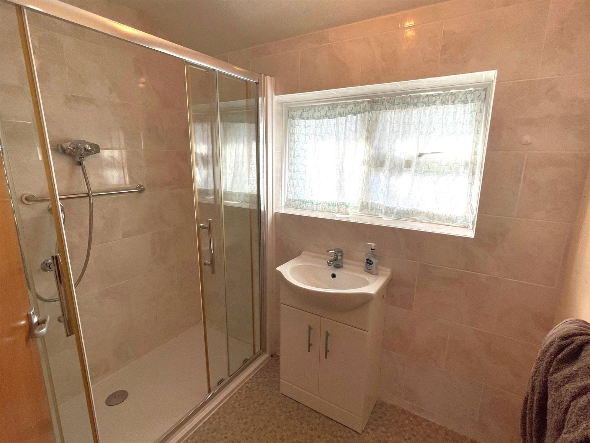 Window to rear. Inset wash hand basin with cupboard below. Walk-in shower with glazed screen. Complementary tiling. Radiator.