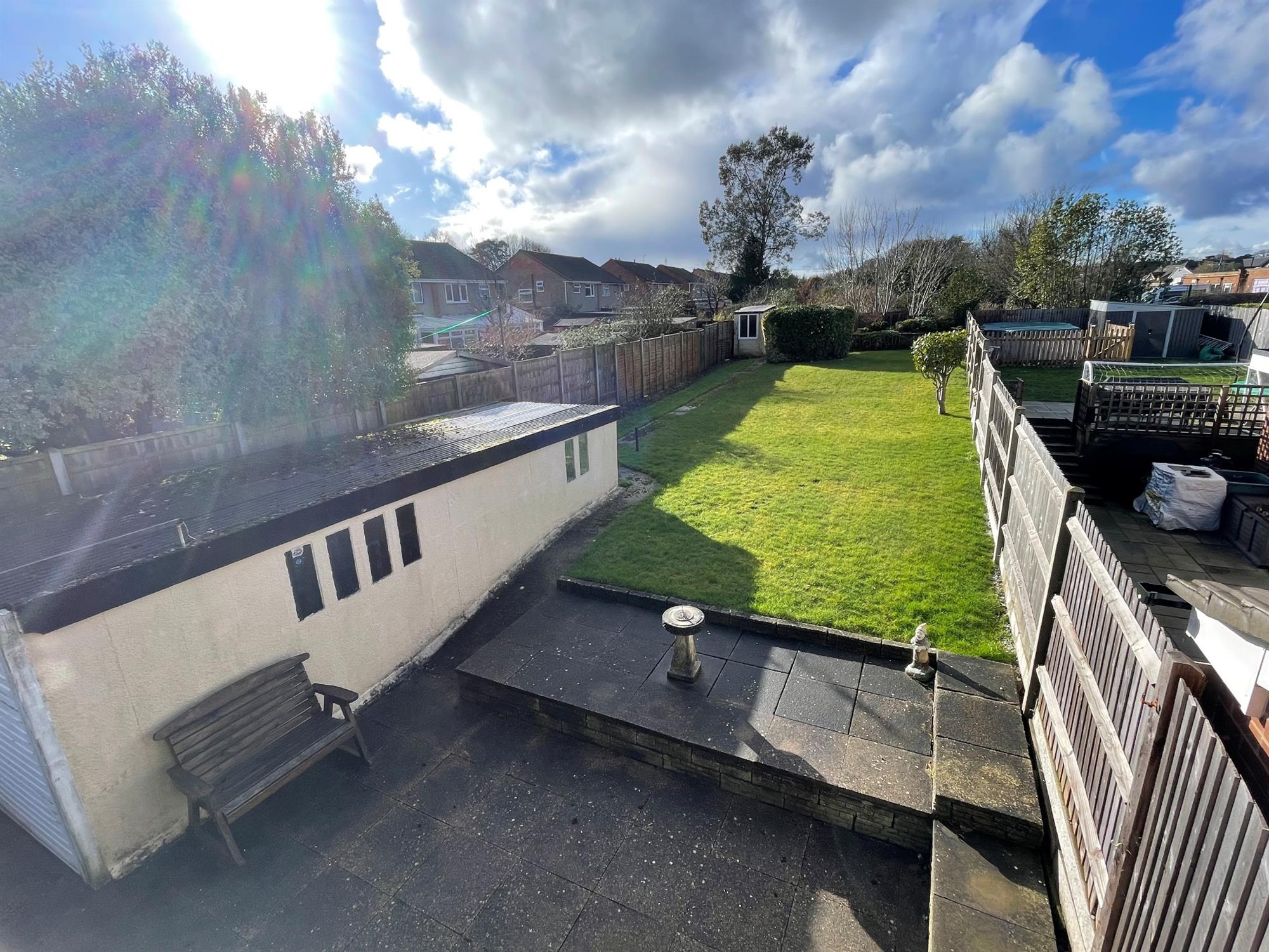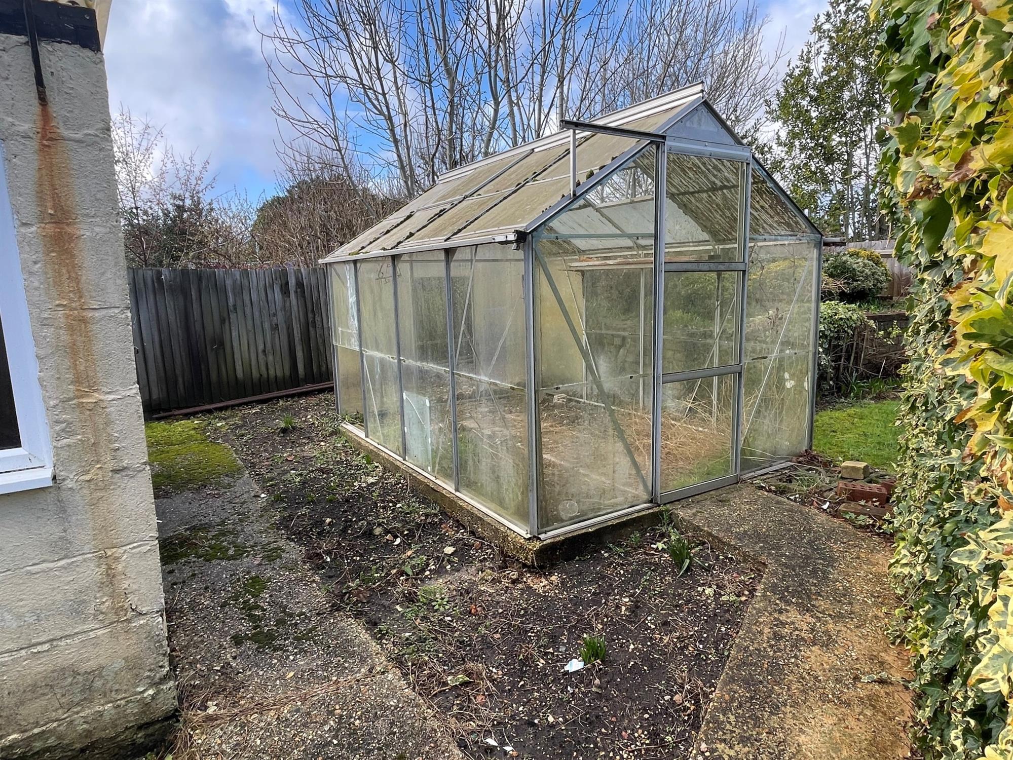 Fenced to boundaries. Paved patio. Laid to lawn with shrubs and bushes. Greenhouse. Brick built storage shed.