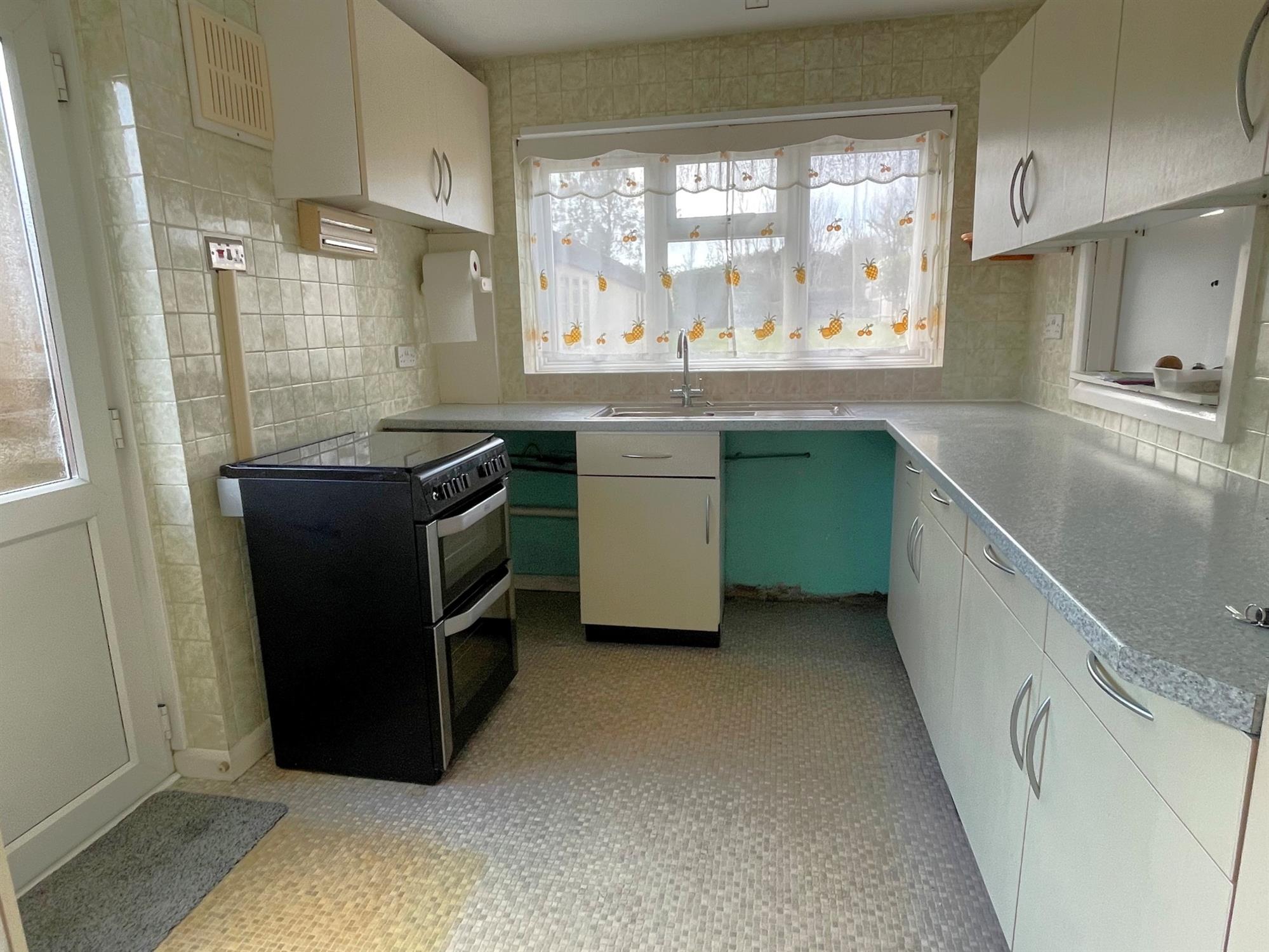 Window to rear. Range of wall and base units with work surfaces over. Single drainer stainless steel sink unit. Tiled splashbacks. Space for cooker. Space and plumbing for washing machine. Door to side.