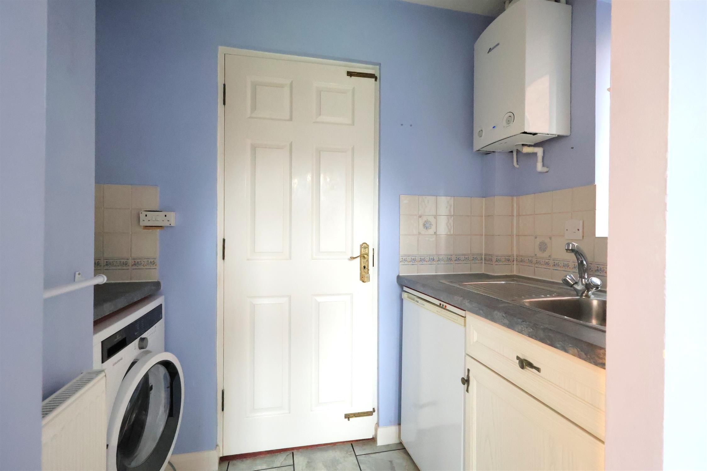 Storage cupboard under the stairs. UPVC windows to rear aspect and glazed uPVC door accessing rear garden. Modern light coloured wall and floor units with drawers. Roll edge contrasting worktop incorporating stainless steel sink/drainer. Four ring gas hob with built-in oven under and extractor hood over. Space and plumbing for dishwasher. Further wall cupboards at the end of the kitchen with a fitted breakfast bar. Opening into utility area with plumbing for washing machine. Radiator. Further cupboards and wall mounted gas boiler, with stainless steel sink/drainer set into worktop. Internal door accessing garage.