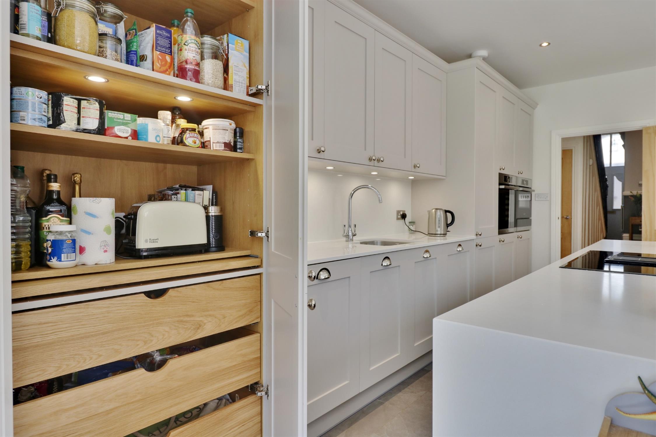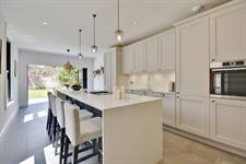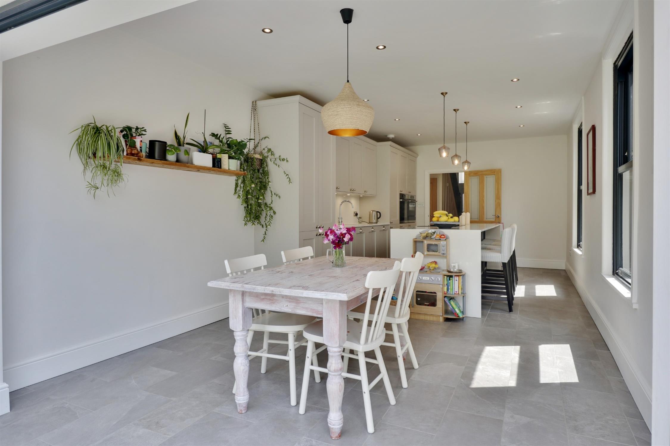 Smooth ceiling, inset spotlights, pendant lights over island unit, bi-folding doors onto rear garden, two double glazed ash windows to side return, a modern range of wall and base mounted units with quartz worktops over, inset sink and drainer. Island/breakfast bar unit with contrasting units, integrated electric induction hob with counter level extractor fan, two integrated high level electric ovens and warming tray. Integrated dishwasher, integrated fridge, integrated freezer, pantry cupboard and porcelain tiles with underfloor heating.