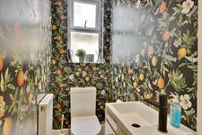 Smooth ceiling, inset spotlights, double glazed obscured window, low level WC, wash hand basin with cupboards beneath, radiator, decorative wallpaper and vinyl tiled floors.