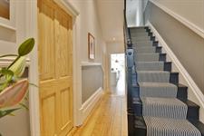 Smooth ceiling, ornate cornicing, decorative plaster arch, inset spotlights, high skirting boards, column radiator, stairs rising to first floor landing with carpet runner and stair rods. Exposed floorboards.
