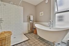 Smooth ceiling, inset spotlights, extractor fan, double glaze obscured window, large shower cubicle, free standing clawfoot bath tub, low level WCX, wash hand basin with marble top and drawer beneath. Airing cupboard containing pressurised water tank, part wood panelled walls, decorative tiled floor.