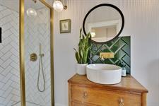 Smooth ceiling, extractor fan, double glazed obscured sash window, tiled shower cubicle, wash hand basin set in antique drawer unit, low level WC, column radiator, part tiled walls, tiled flooring and under floor heating.