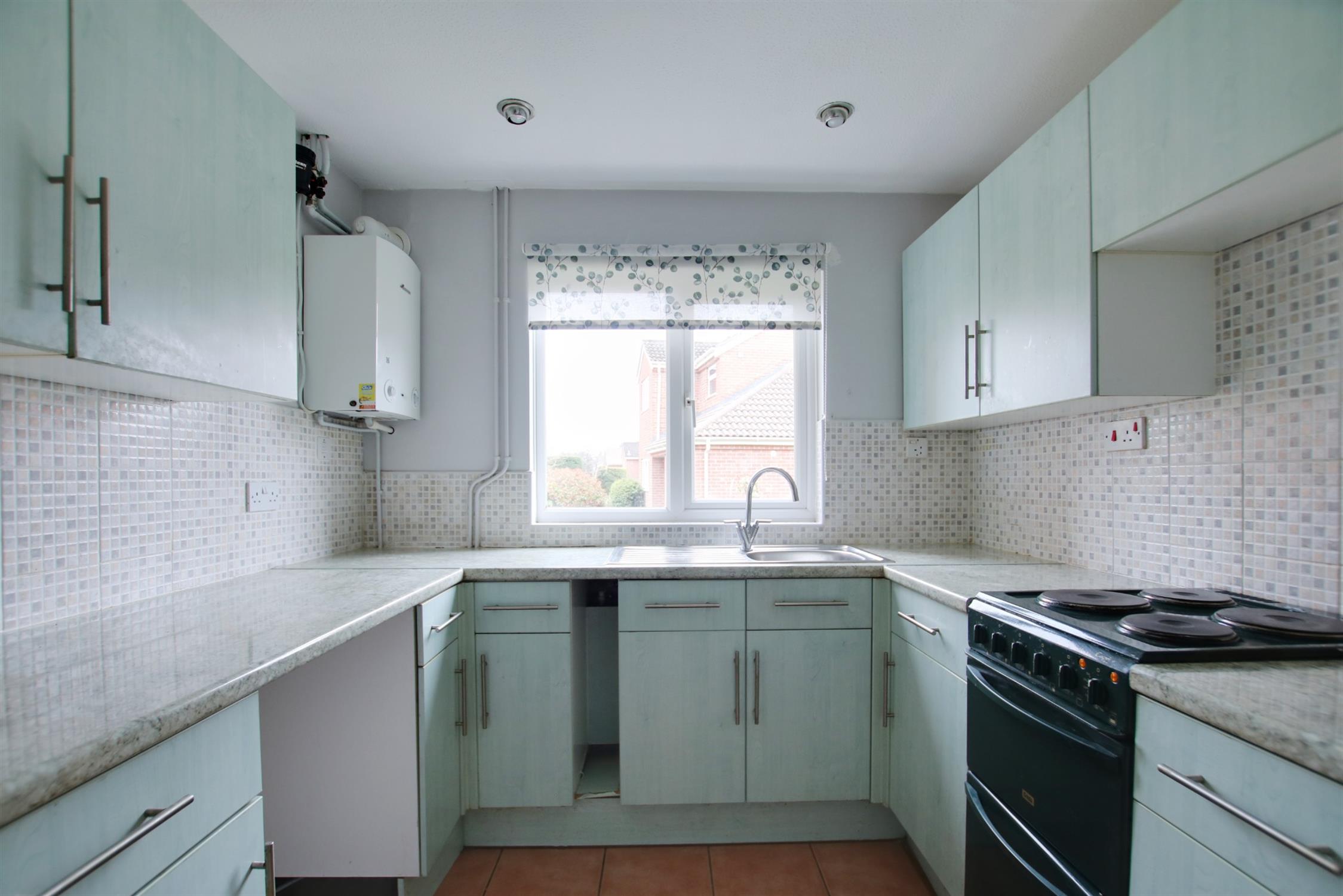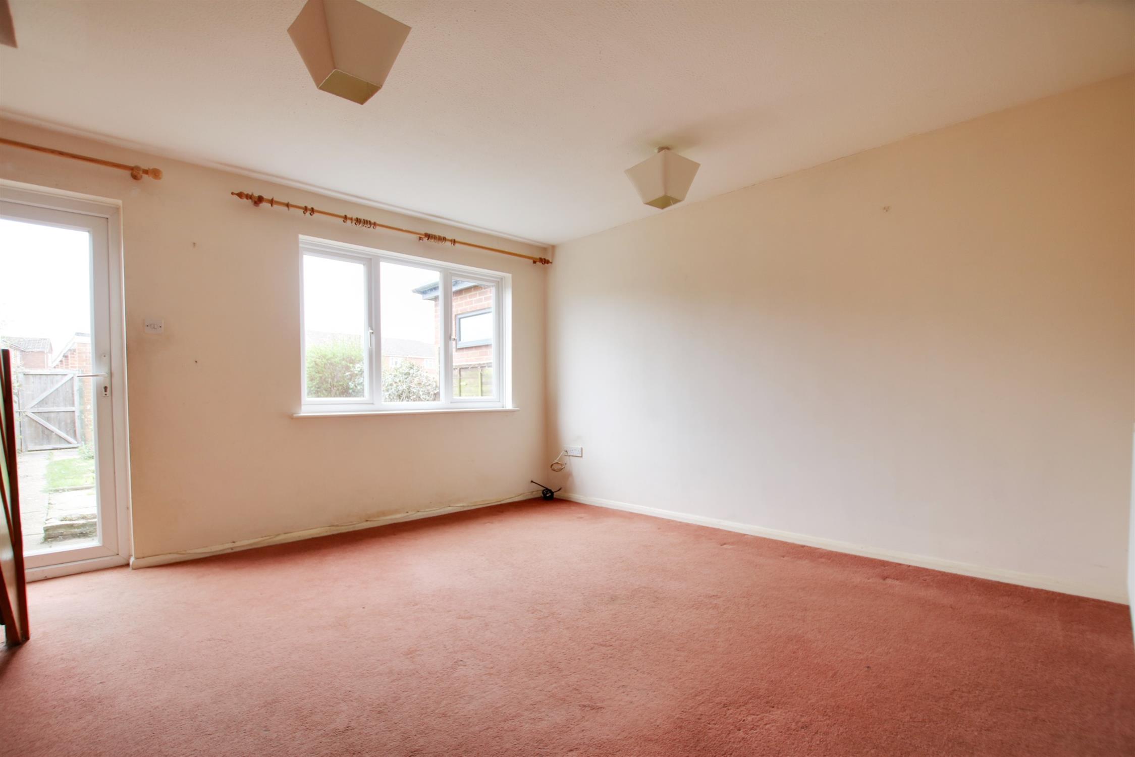 The property is set back from the road and a path leads to the front door. Upon entry, there is a porch with built in storage cupboard. The central hall has doors to the kitchen, living room and further storage cupboards. The kitchen sits to the front of the property and is fitted with a range of eye and low level units. The living room is spacious in size, offering space for both lounge and dining furniture.