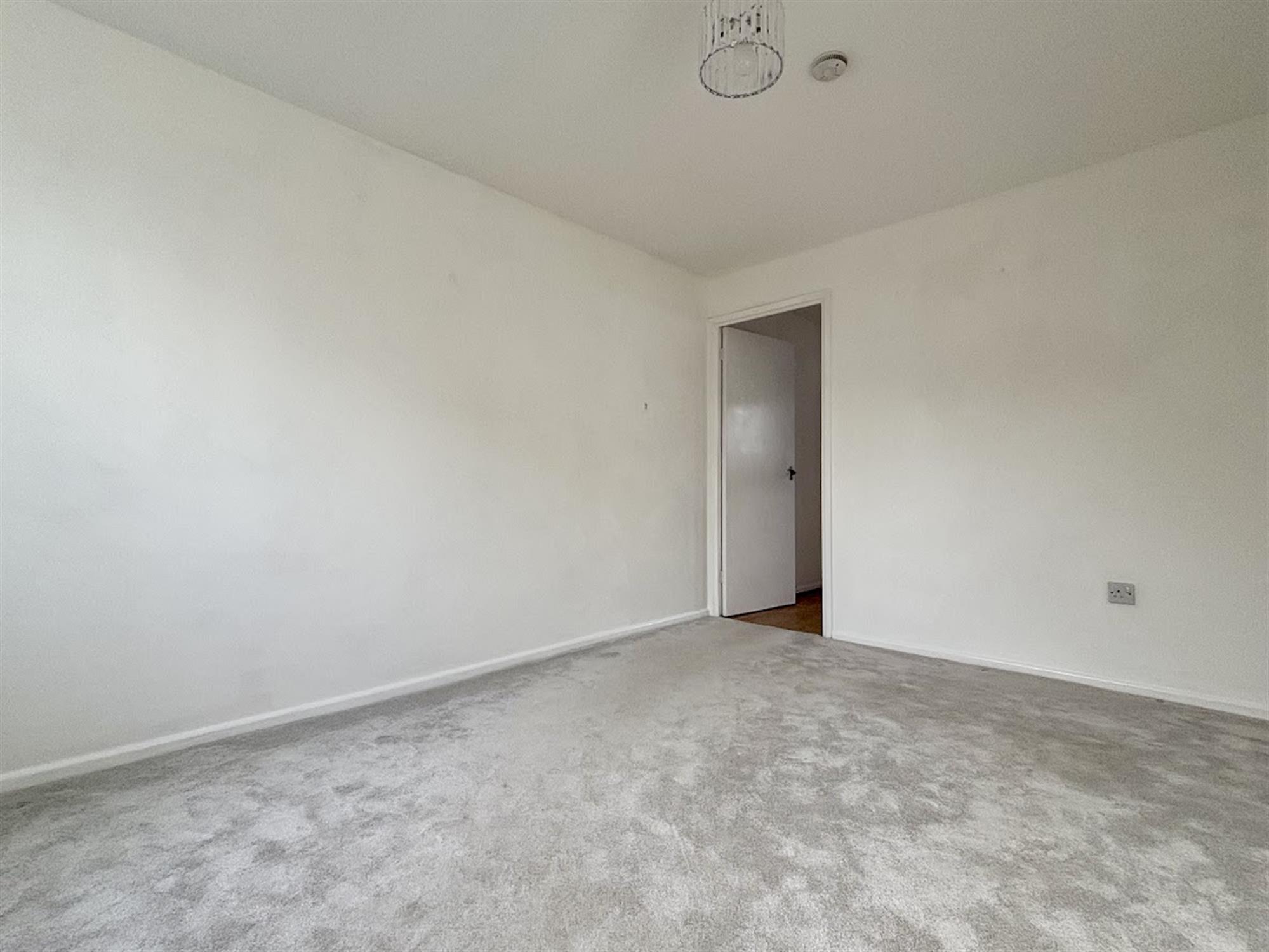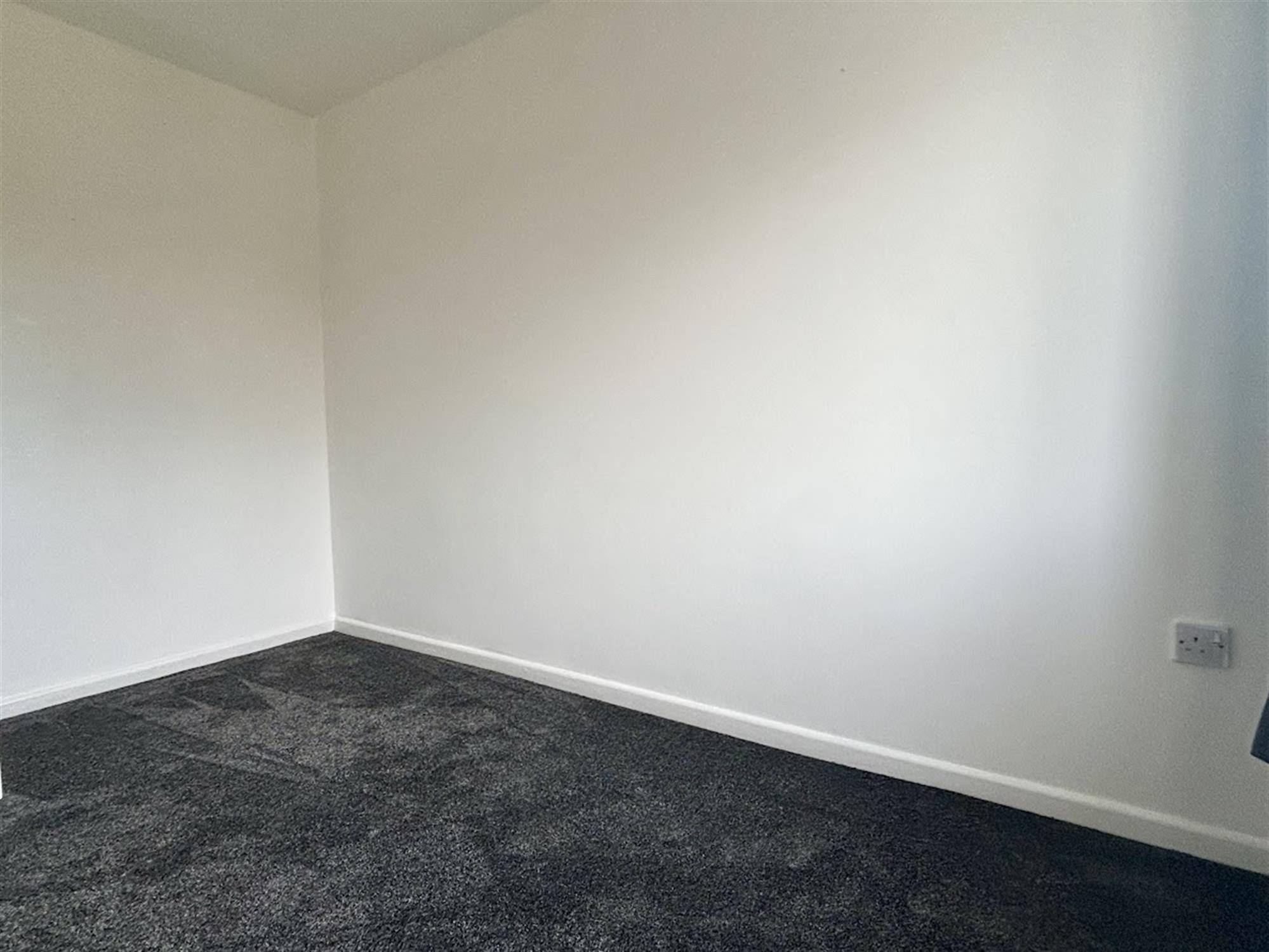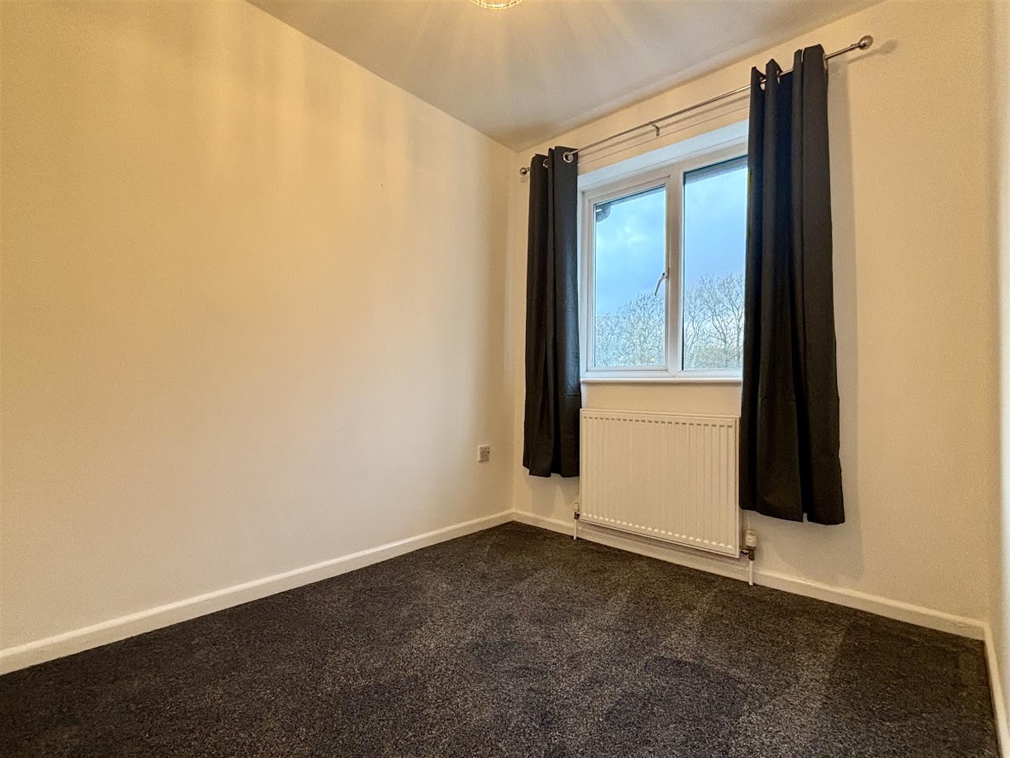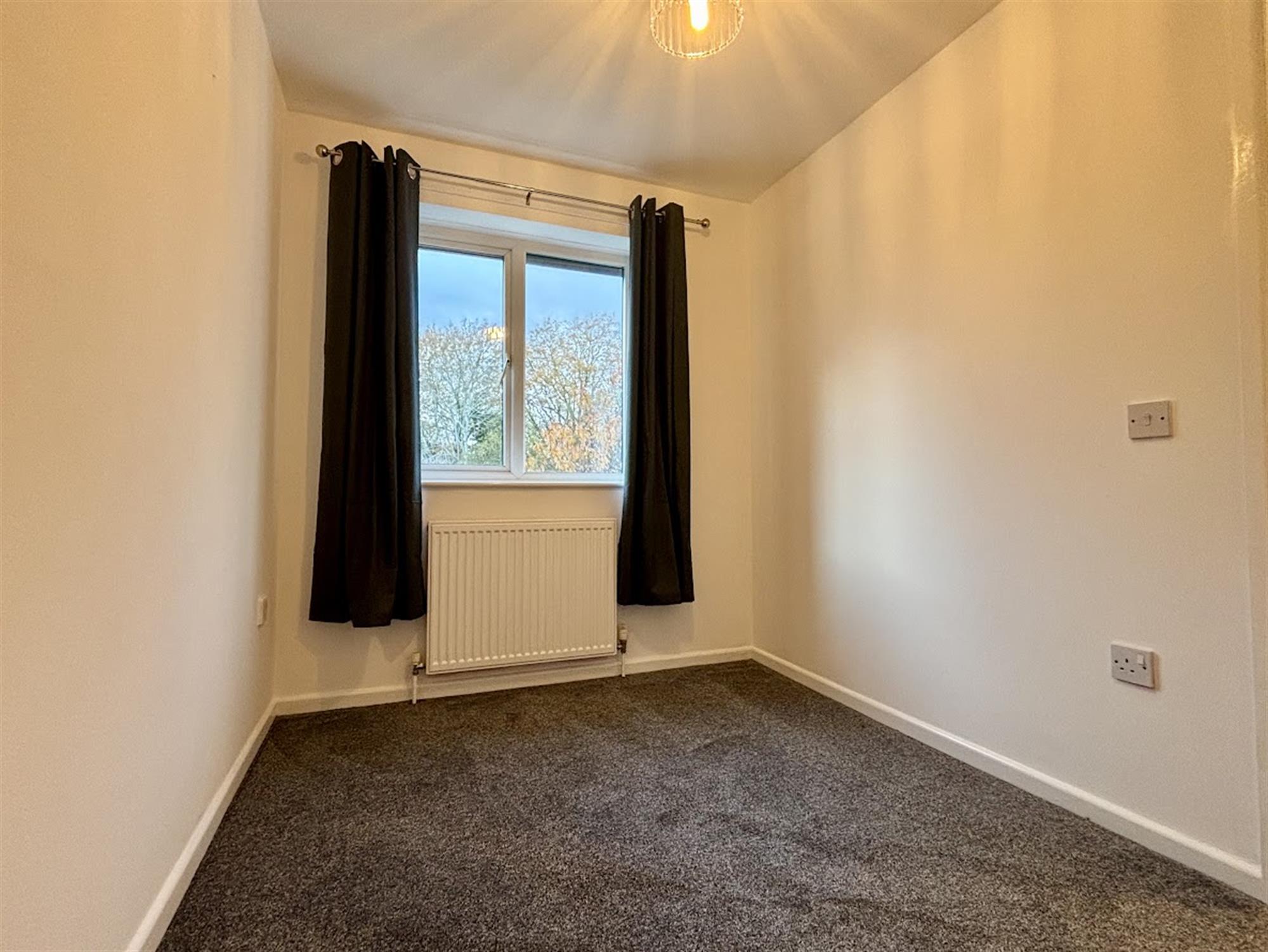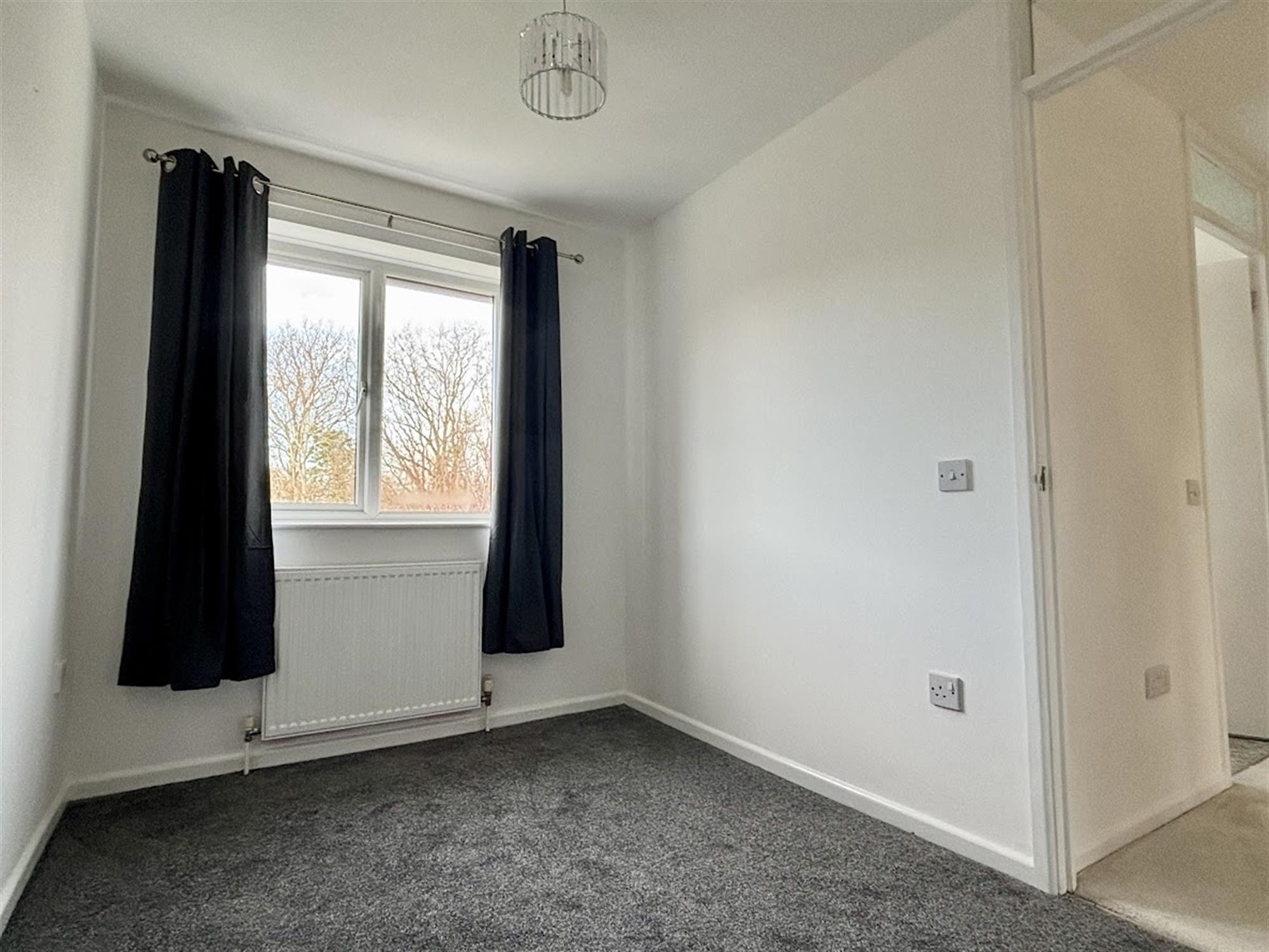 A smaller double bedroom with dark grey carpet flooring, white painted walls and ceiling, and a window to the rear.