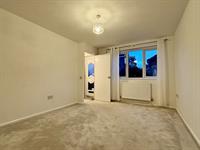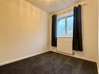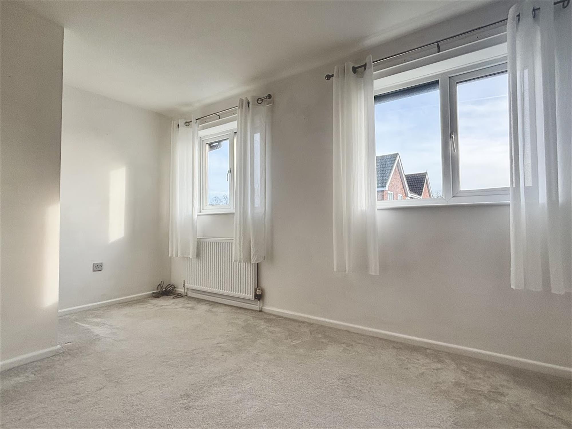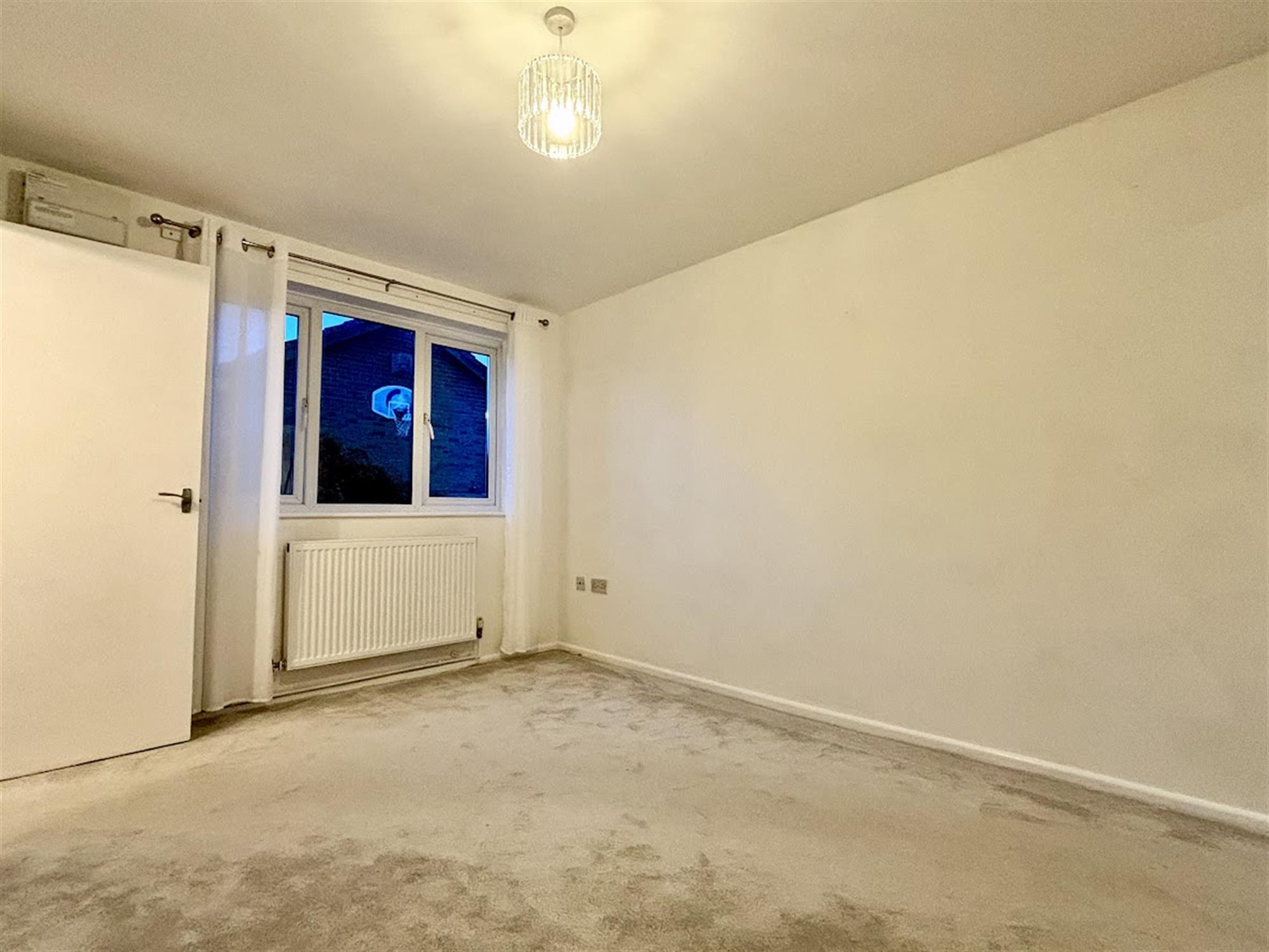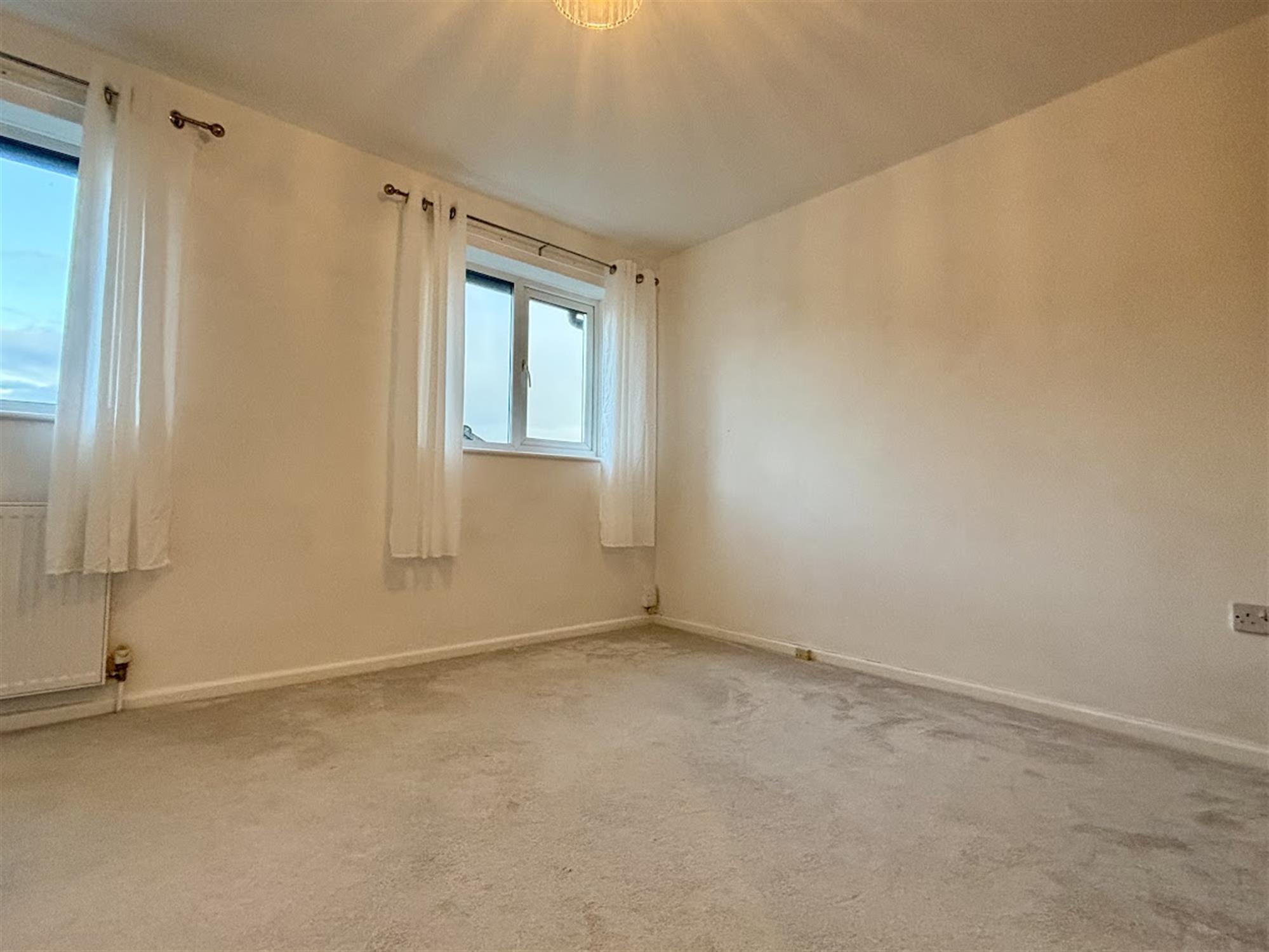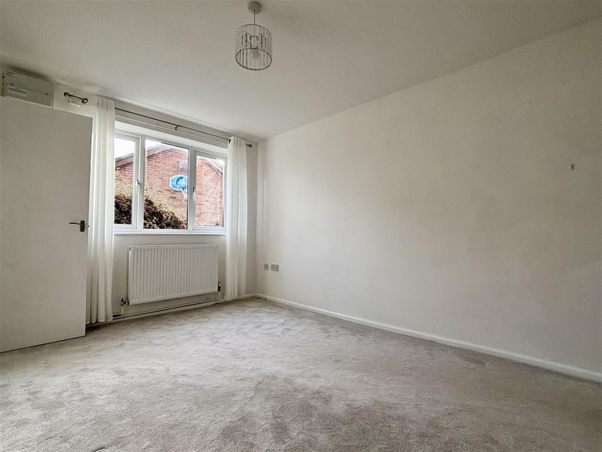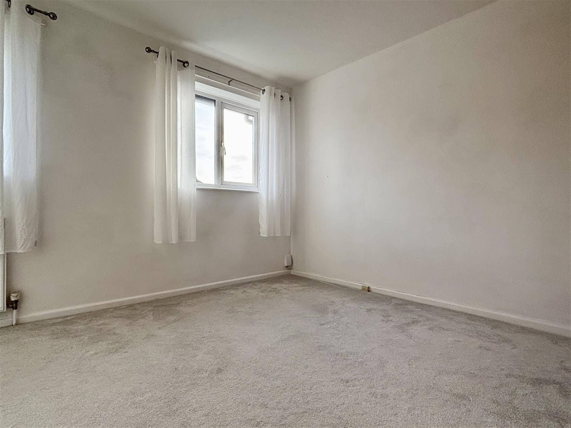 A smaller double bedroom with dark grey carpet flooring, white painted walls and ceiling, and a window to the rear.