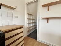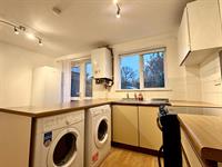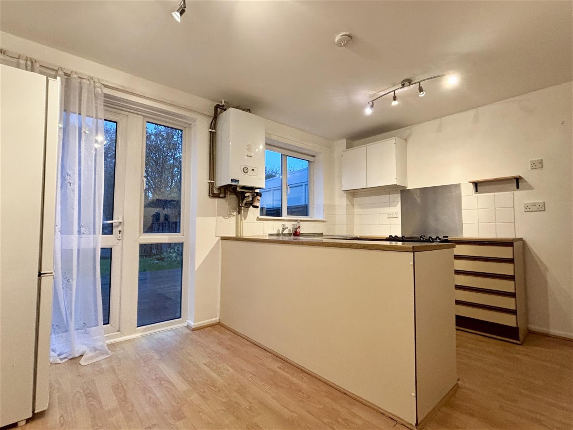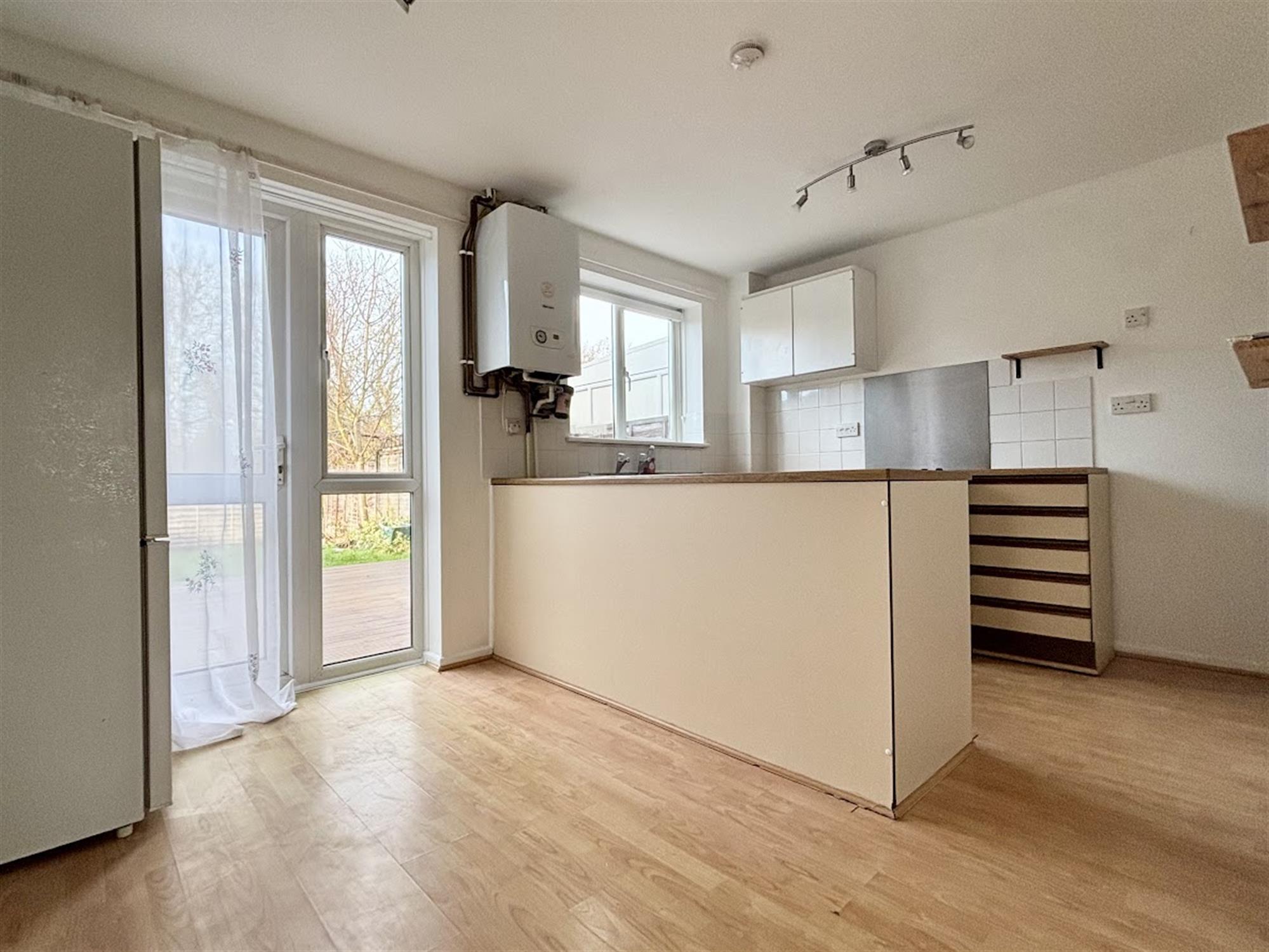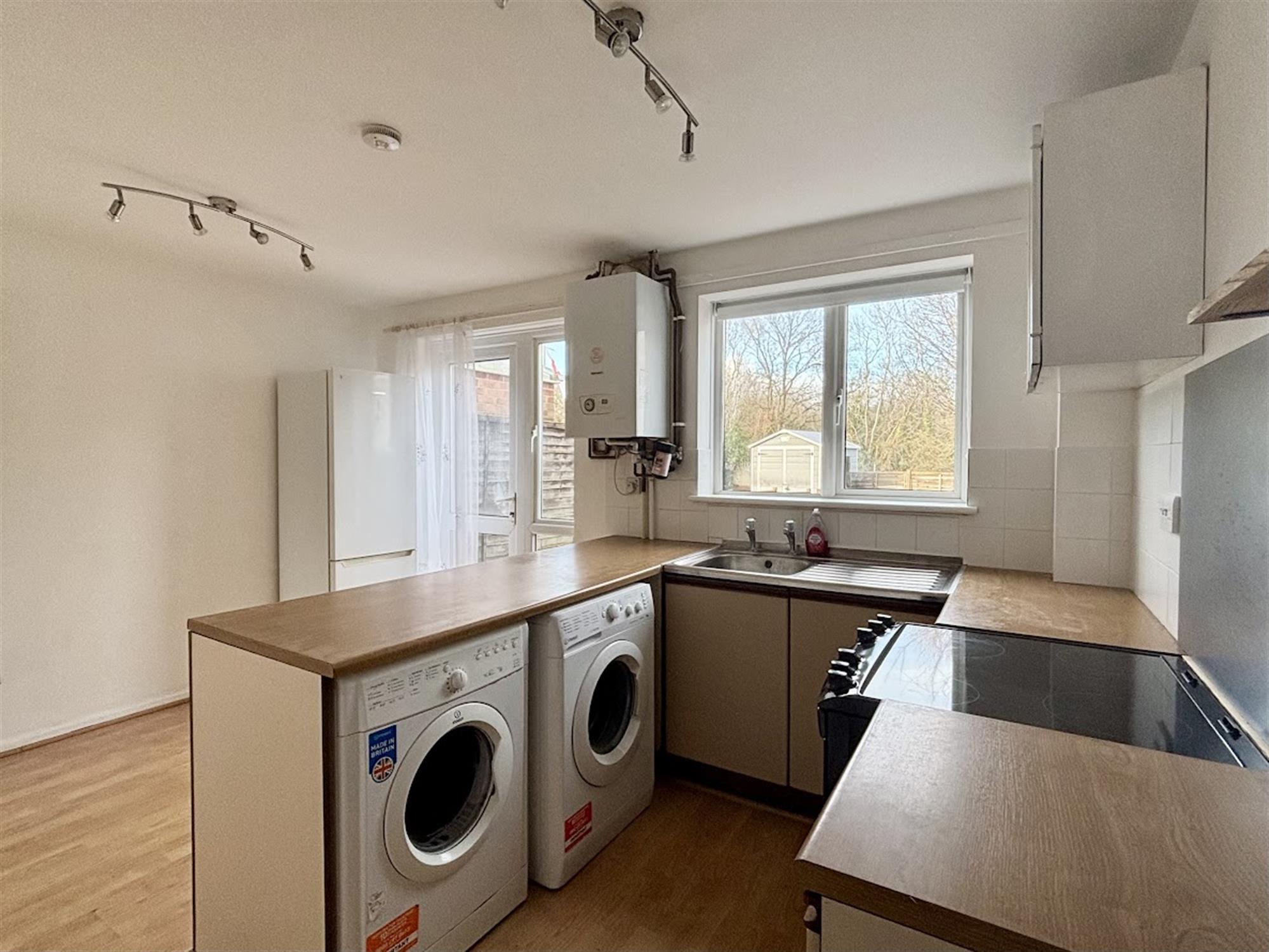 An open space with light wood laminate flooring, a range of wall and base units in a U-shaped style, with white painted walls and ceiling appliances include a washing machine, a tumble dryer, a fridge/freezer, an understairs cupboard for plenty of storage, a window to the rear and patio doors leading to the garden.