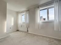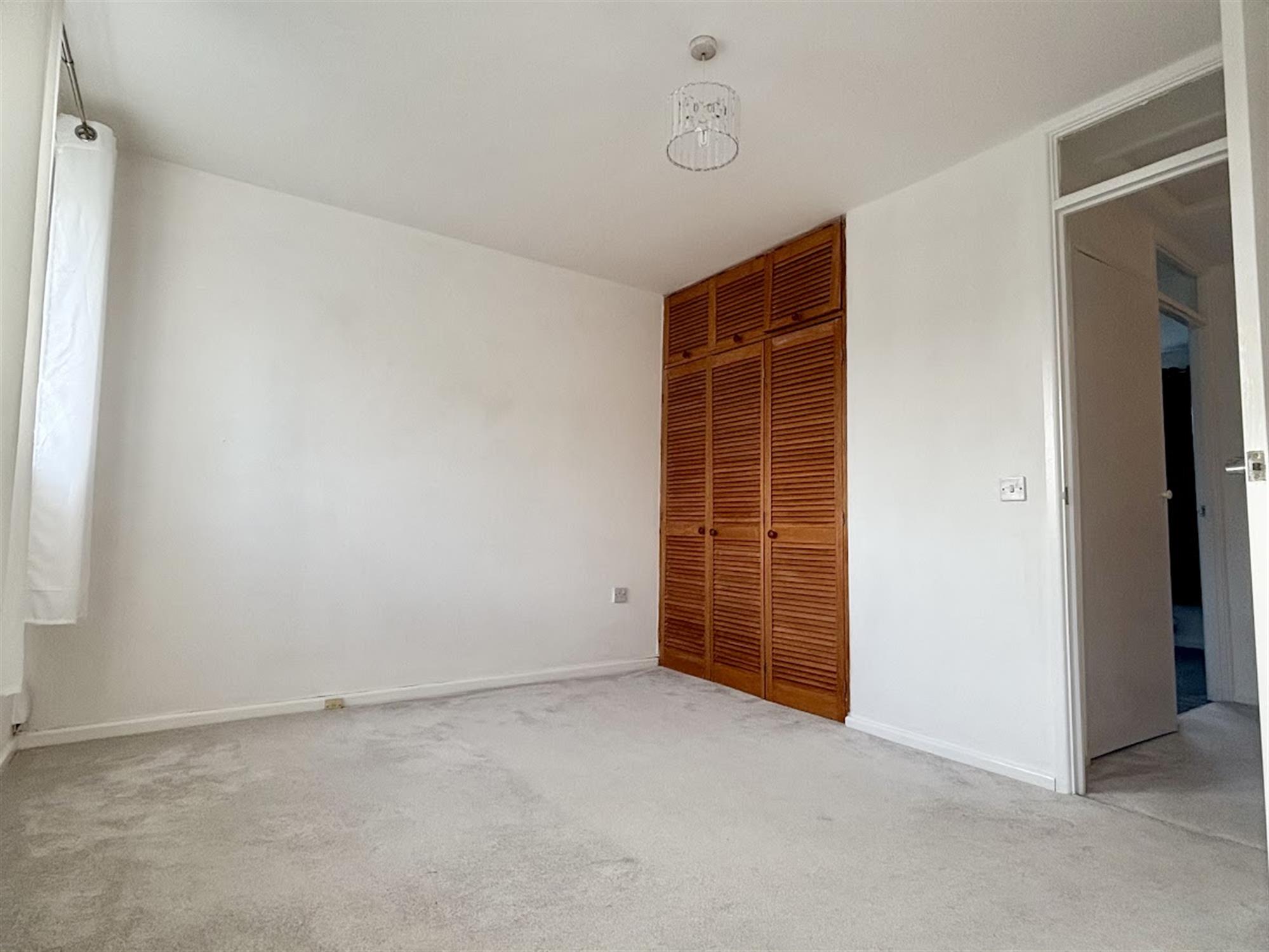 A good-sized double bedroom with light grey carpet flooring, white painted walls and ceiling, a built-in wardrobe and two windows to the front.