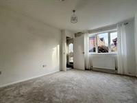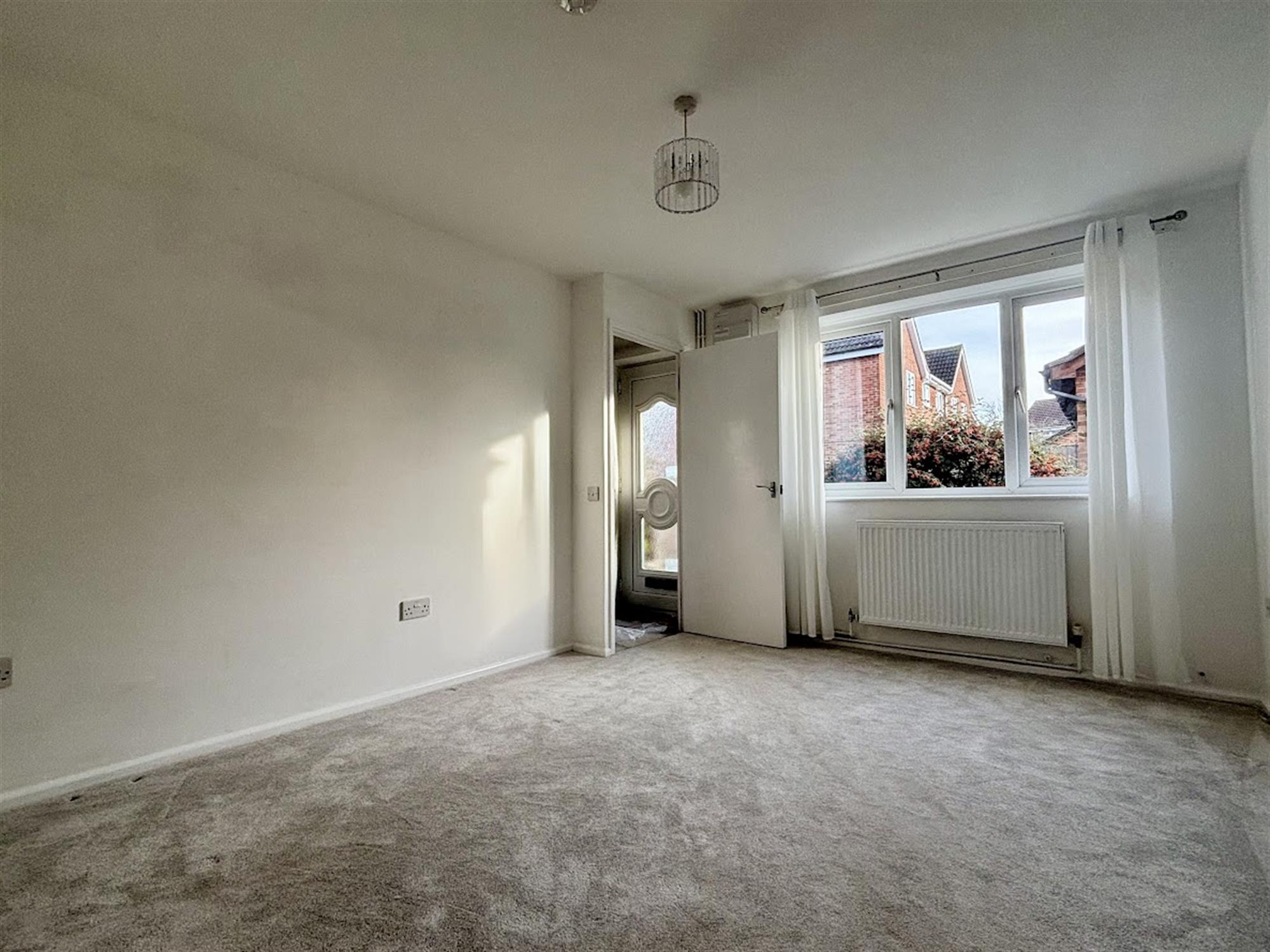 A good-sized room with light grey carpet flooring, white painted walls and ceiling, a large window to the front and a door leading to the kitchen/breakfast room.