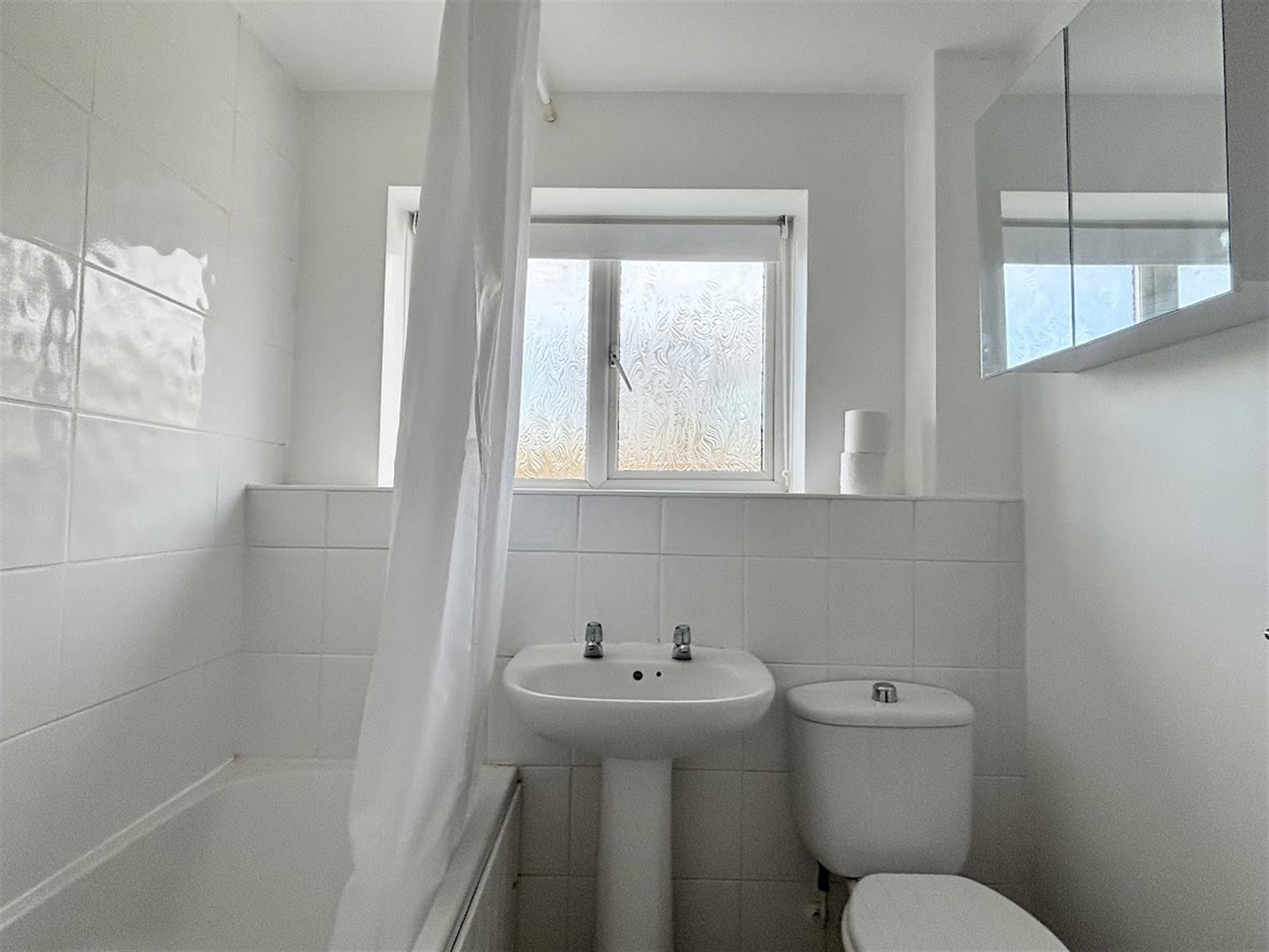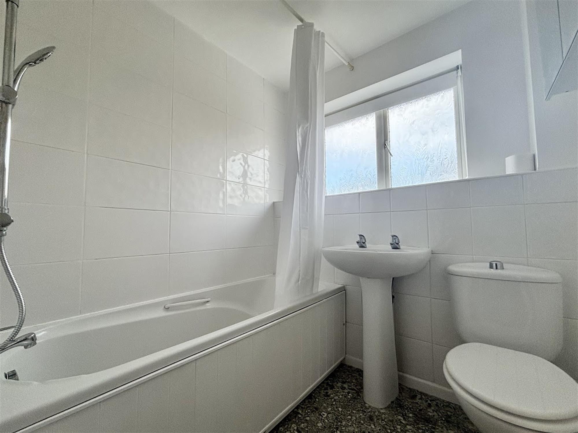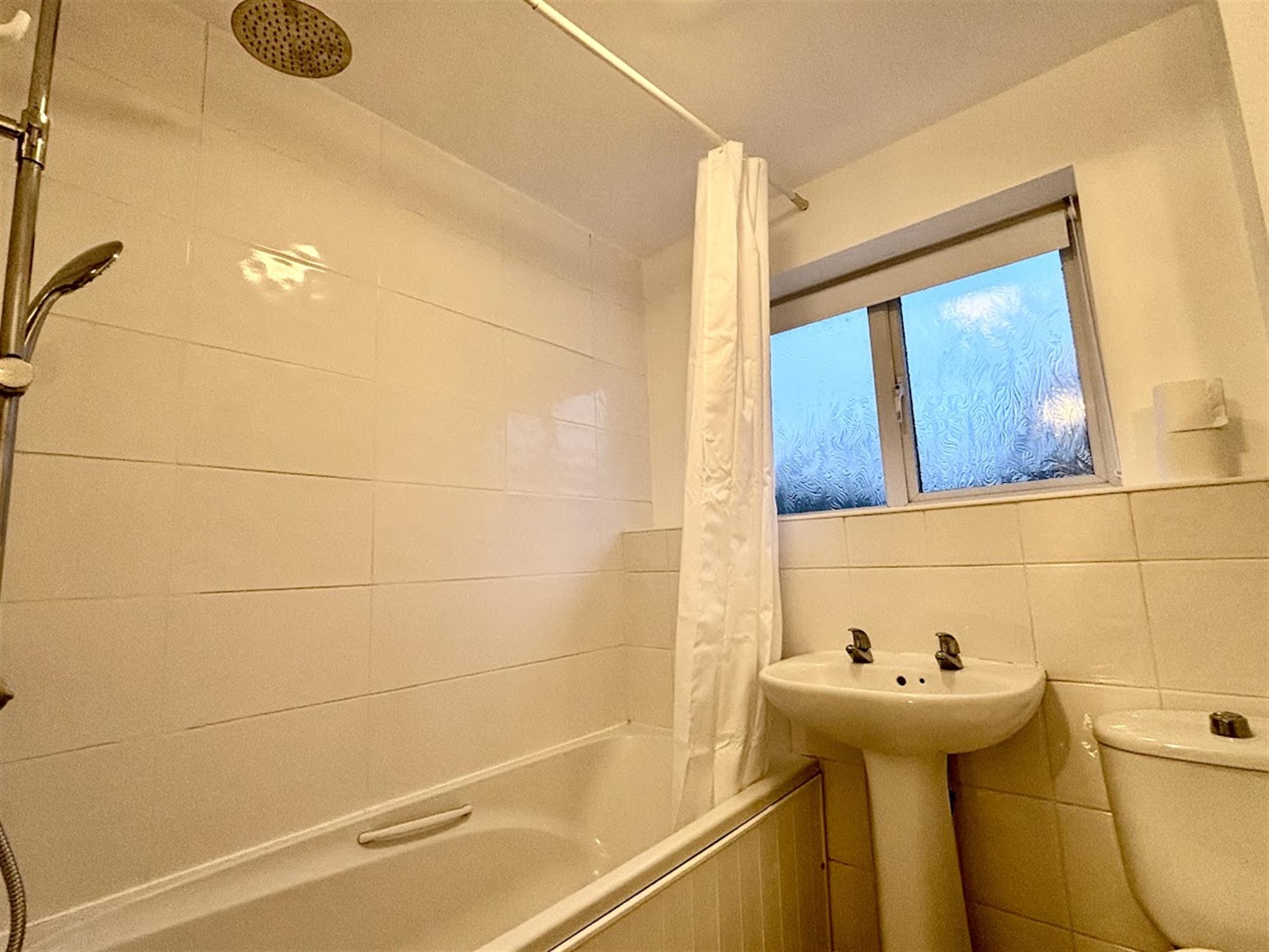 A white three-piece bathroom suite, with a waterfall shower over the bath, plus a handheld shower, a basin and WC. There is also a wall-mounted vanity cupboard with mirror doors, mixed grey flooring and a window to the rear.