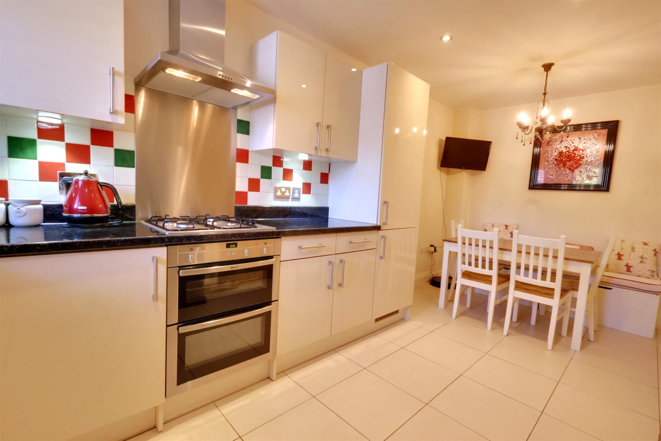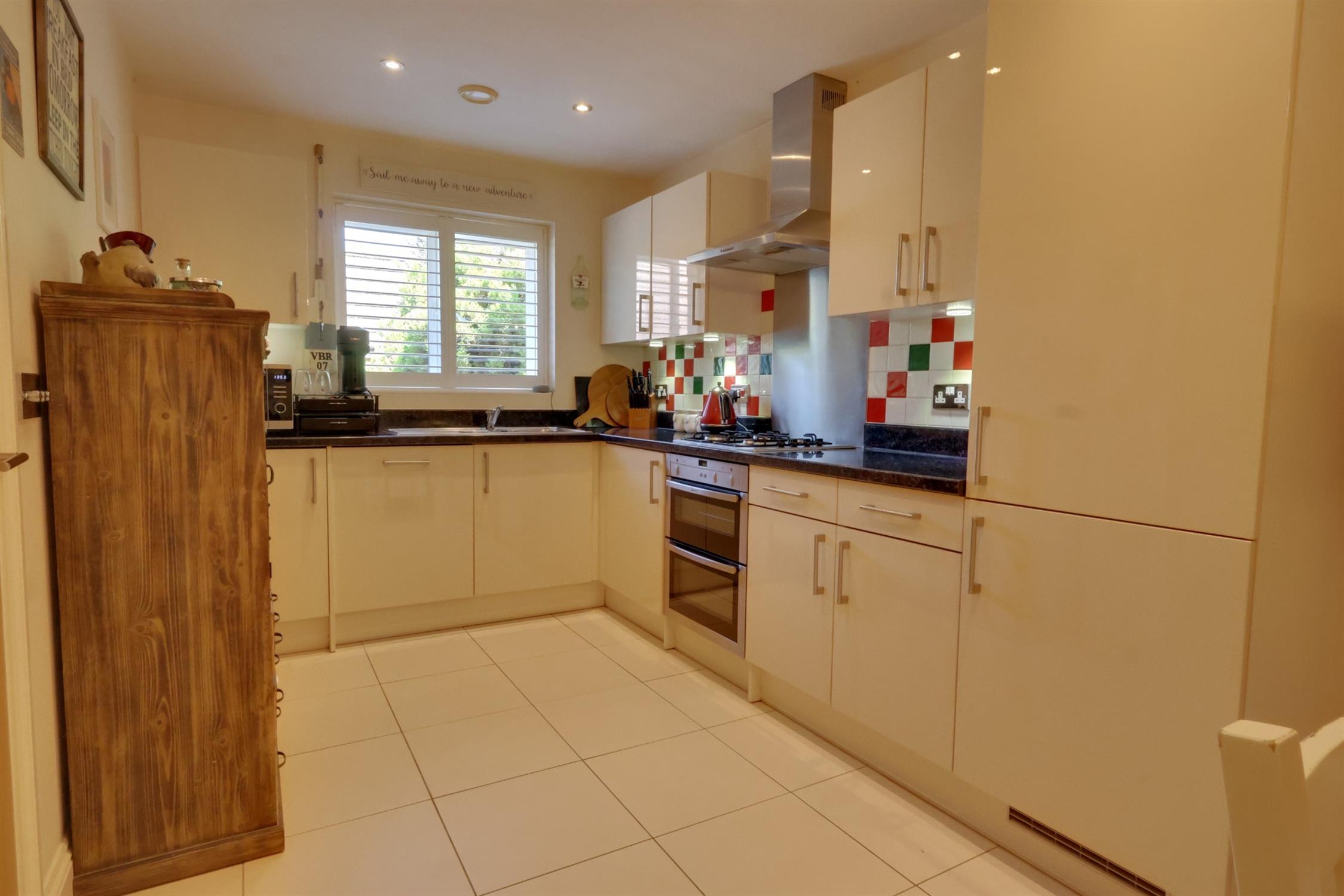 Range of fitted floor and wall units with contrasting work tops and complimentary tiling to walls. Inset sink unit. Plumbing for automatic washing machine and dishwasher. Four ring gas hob with built in double oven below and extractor hood over. Integrated fridge / freezer. Tile floor . Radiator. Double glazed window to side.