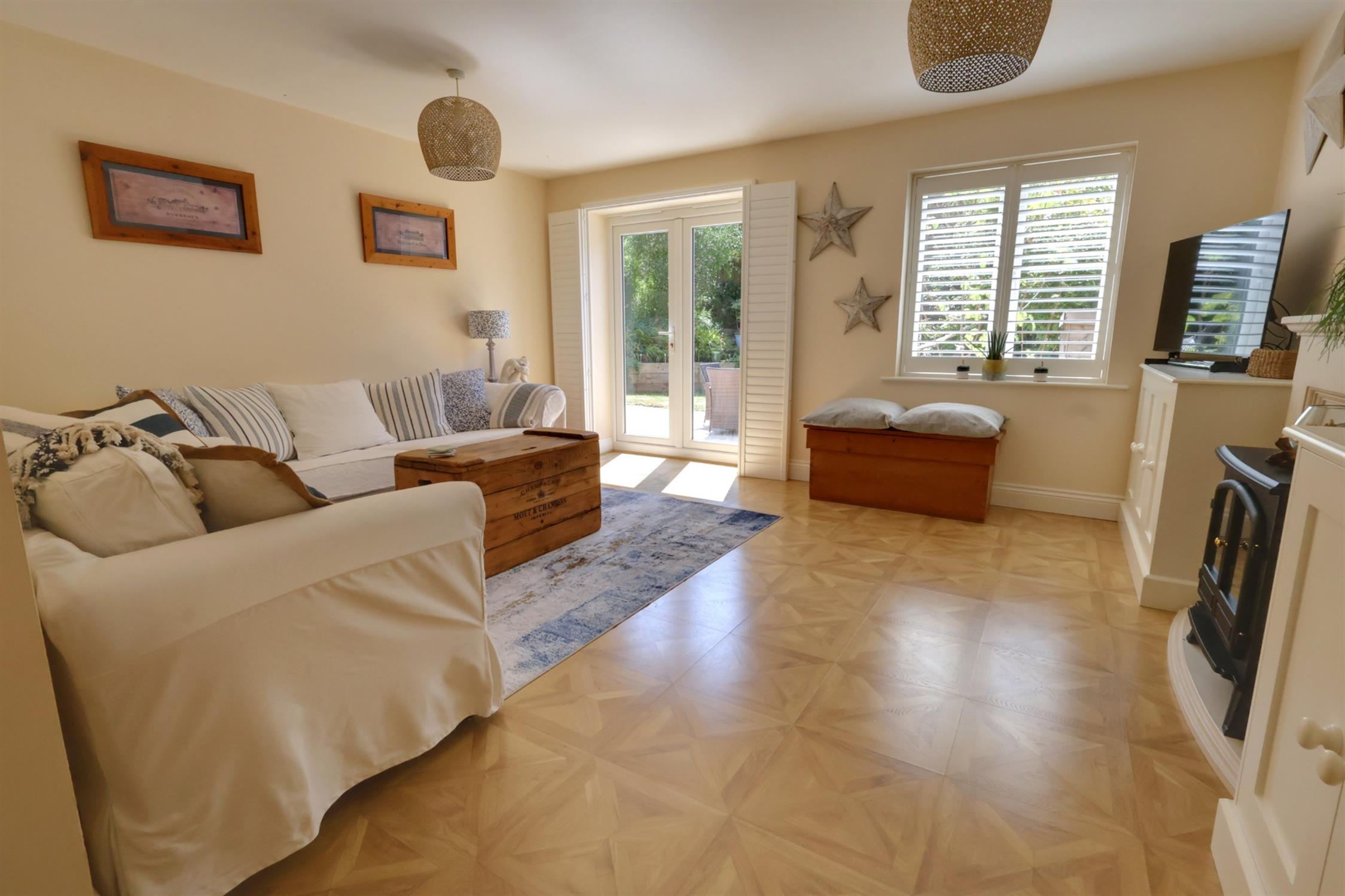 Set around feature fireplace and surround. Radiator. Double glazed window and French style double doors to rear garden.