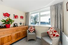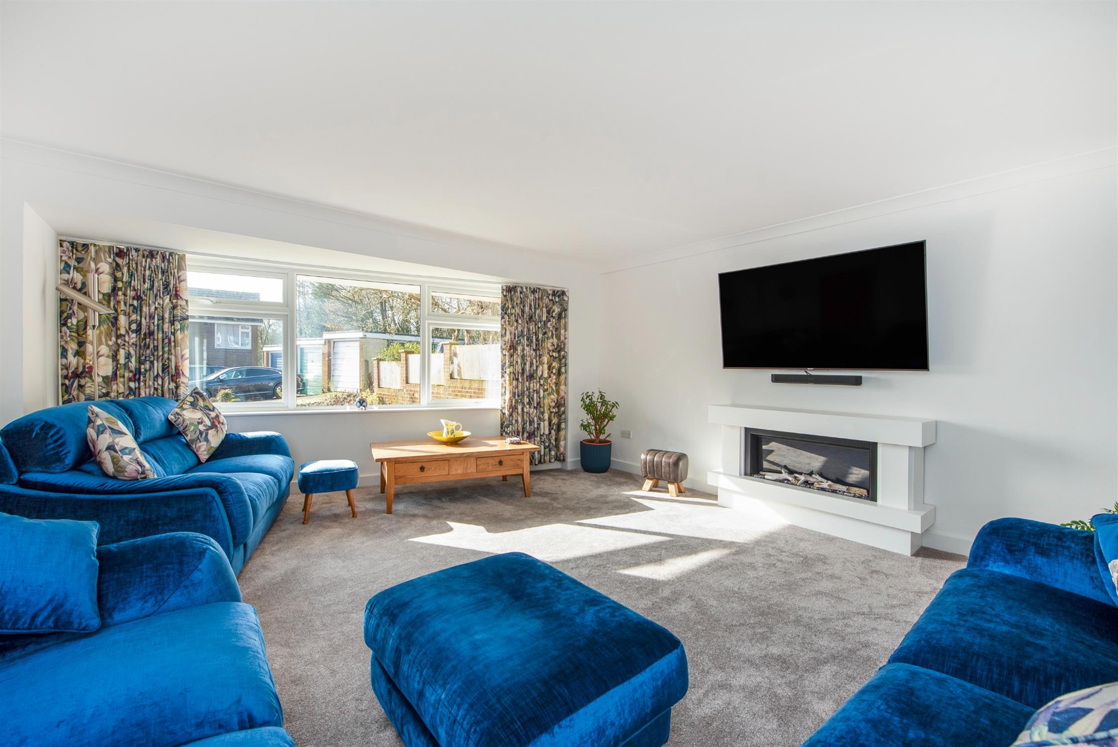 Large southerly aspect room with picture window set around feature wall mounted living flame electric fire. Point for wall mounted T.V. Two radiators. Three wall light points.