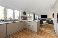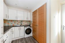 Range of high gloss finish floor and wall units with contrasting work surfaces and complimentary tiling to walls. Plumbing for automatic washing machine, space for tumble dryer. Radiator. Cupboard housing gas fired boiler and pressurised hot water tank. Double glazed door to side.