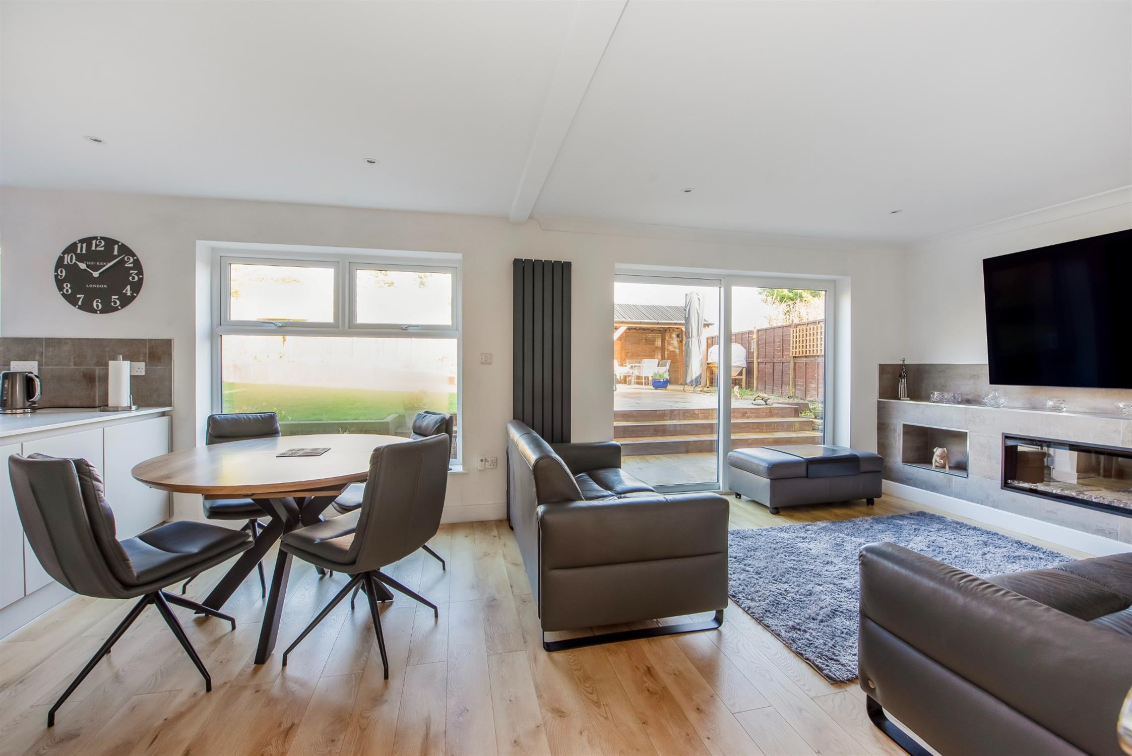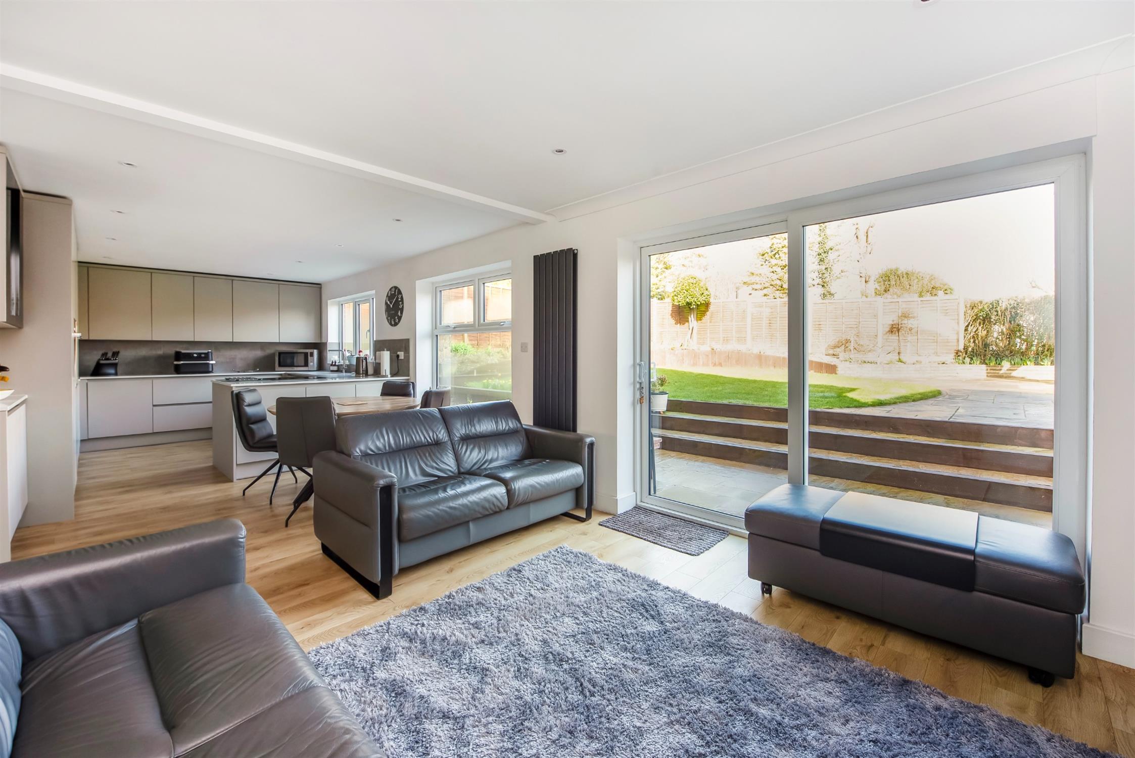 This is a large room overlooking the rear garden perfect for entertaining and family living incorporating a kitchen area, seating area and dining area. Kitchen Area - Range of matt finish floor and wall units incorporating a peninsular cooking and serving area with inset AEG induction hob. Granite work surfaces with complimentary upstands. Inset sink unit, integrated dishwasher and waste bin Integrated full height fridge and freezer. Two eye level AEG convection ovens. Wall mounted smoked glass display cabinet. Double glazed window overlooking rear garden. Dining Area - Double glazed picture window over looking rear garden. Family Area - Feature wall mounted living flame effect electric fire in surround. Wall mounted T.V. point. Upright designer radiator. Double glazed patio door opening to rear garden.