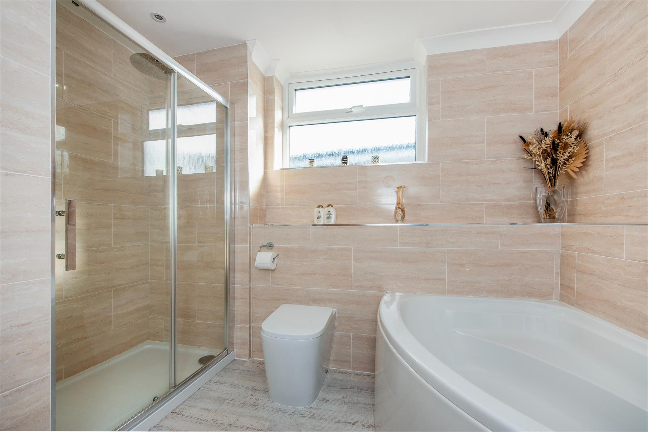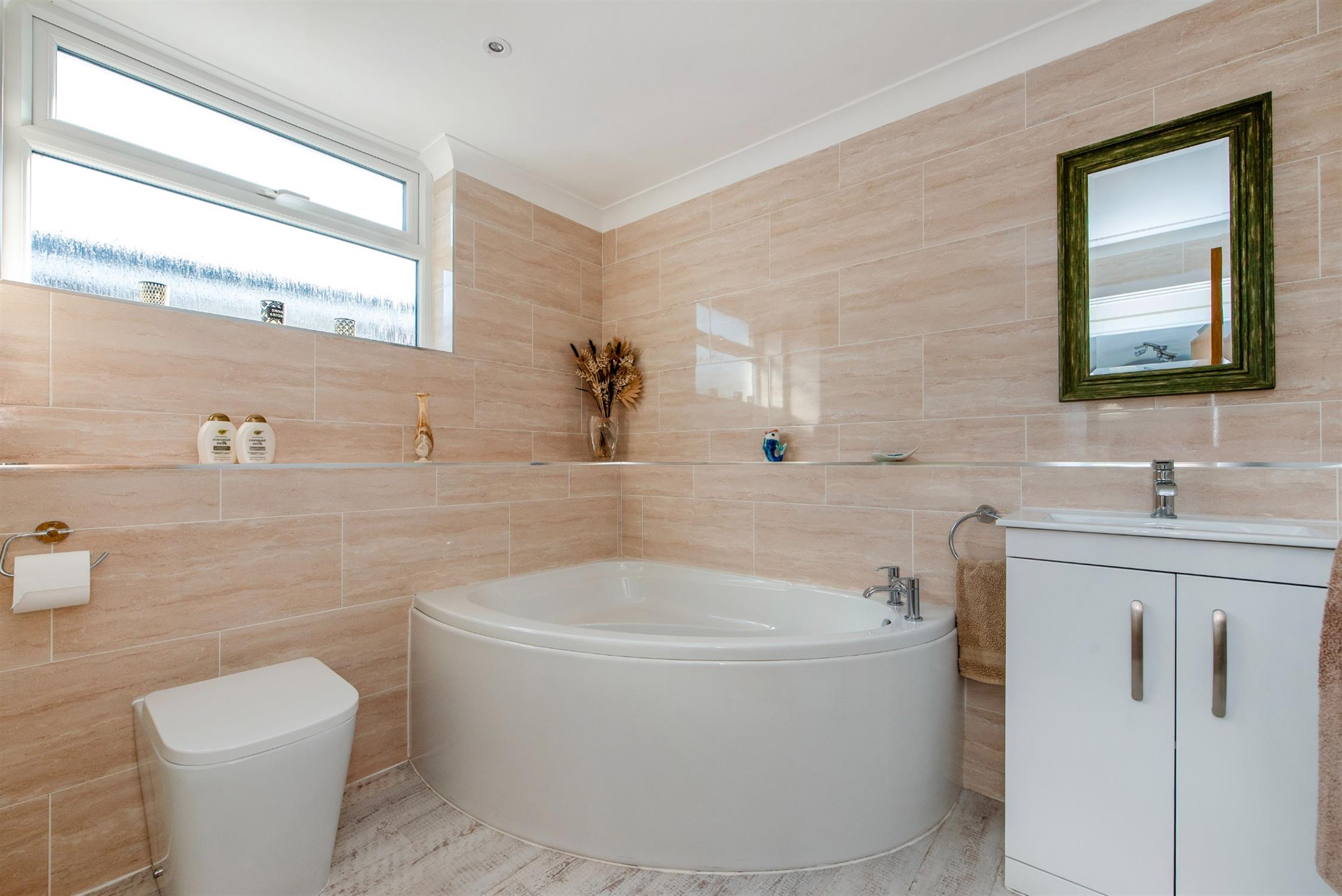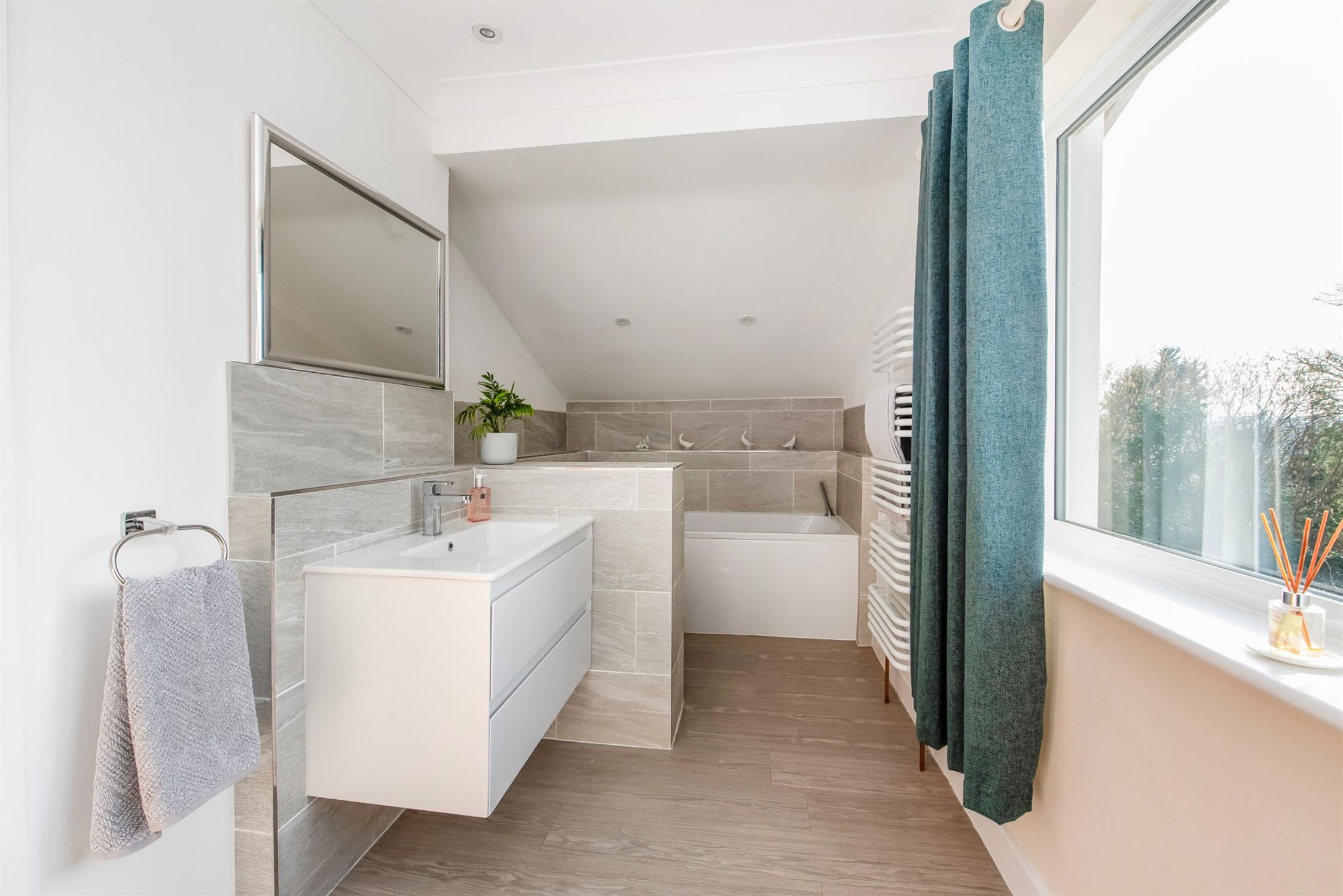 Panel bath, close couple W.C. Wash basin in vanity surround. Designer ladder style radiator. Linen cupboard. Complimentary tiling to walls
