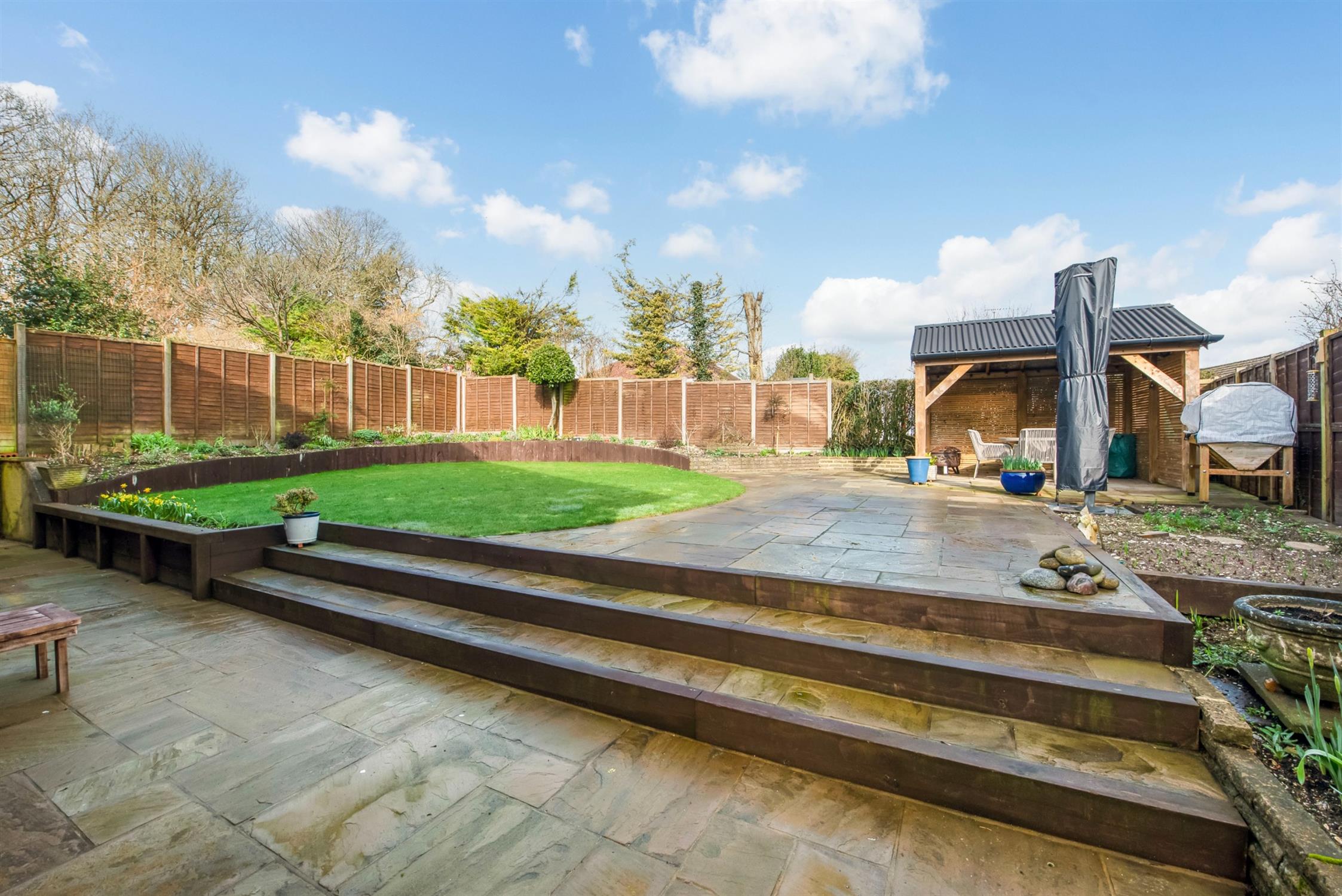 Being a particular feature of the property fully enclose and not overlooked from the rear. Professionally landscaped with a lower seating area with power and lighting. Steps lead up to lawn with flower and shrub borders. There is a large paved seating/entertaining area, barn style gazebo with power.