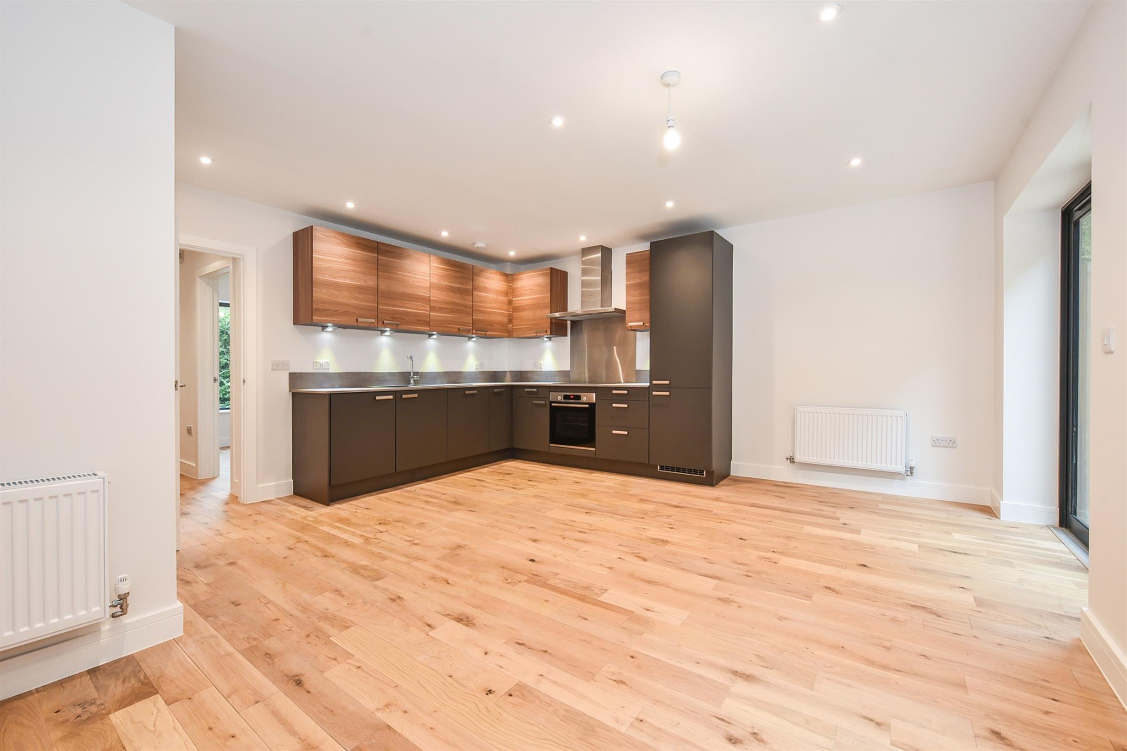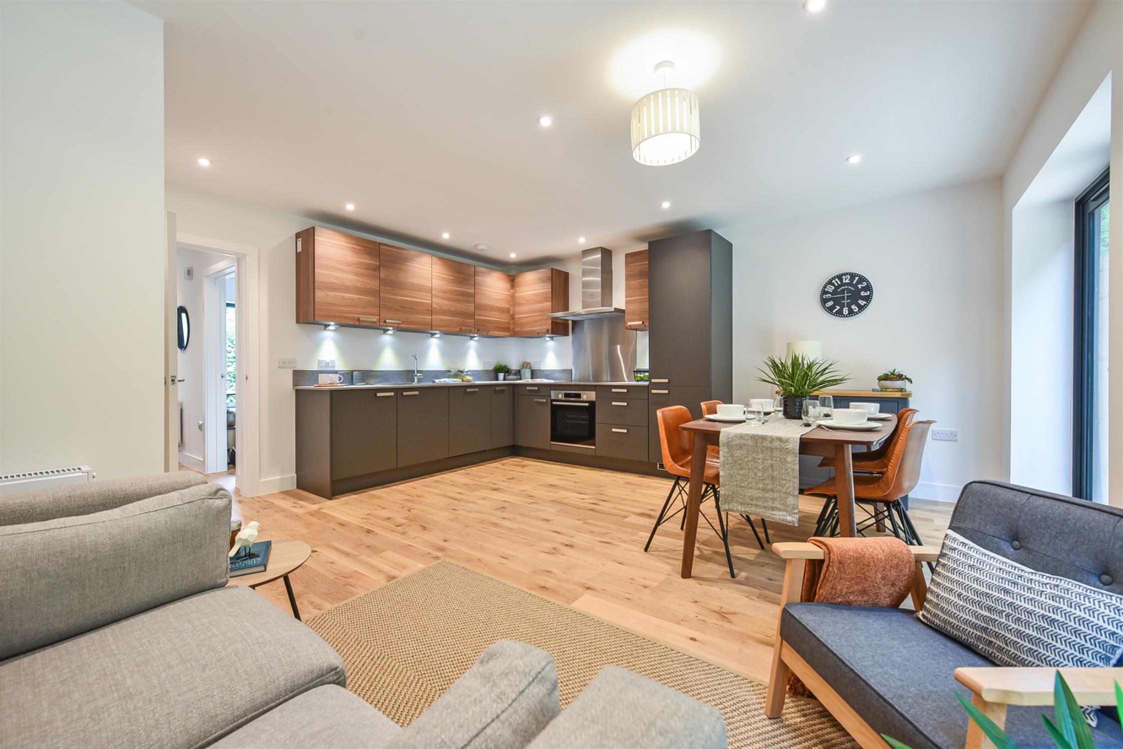 Plot 2 is a terrific semi-detached property. Upon entry through the front door, there is an entrance hall with access to all ground floor accommodation and, from here, stairs rise to the first floor. Engineered oak wood flooring runs throughout the ground floor and the property has been neutrally decorated thoughout. The living room sits to the front of the house and the large aspect window allows ample of light into the space. The contemporary kitchen by Controlled Interiors is fitted with a range of eye and low-level units with grey and wood effect drawers and doors, and is fitted with high-specification Bosch appliances. There is plenty of space for dining furniture and also to have a snug seating area, making this a wonderful social space. Double glass doors open to the enclosed rear garden. The ground floor further benefits from a WC fitted with toilet and handbasin, and useful built-in storage under the stairs.