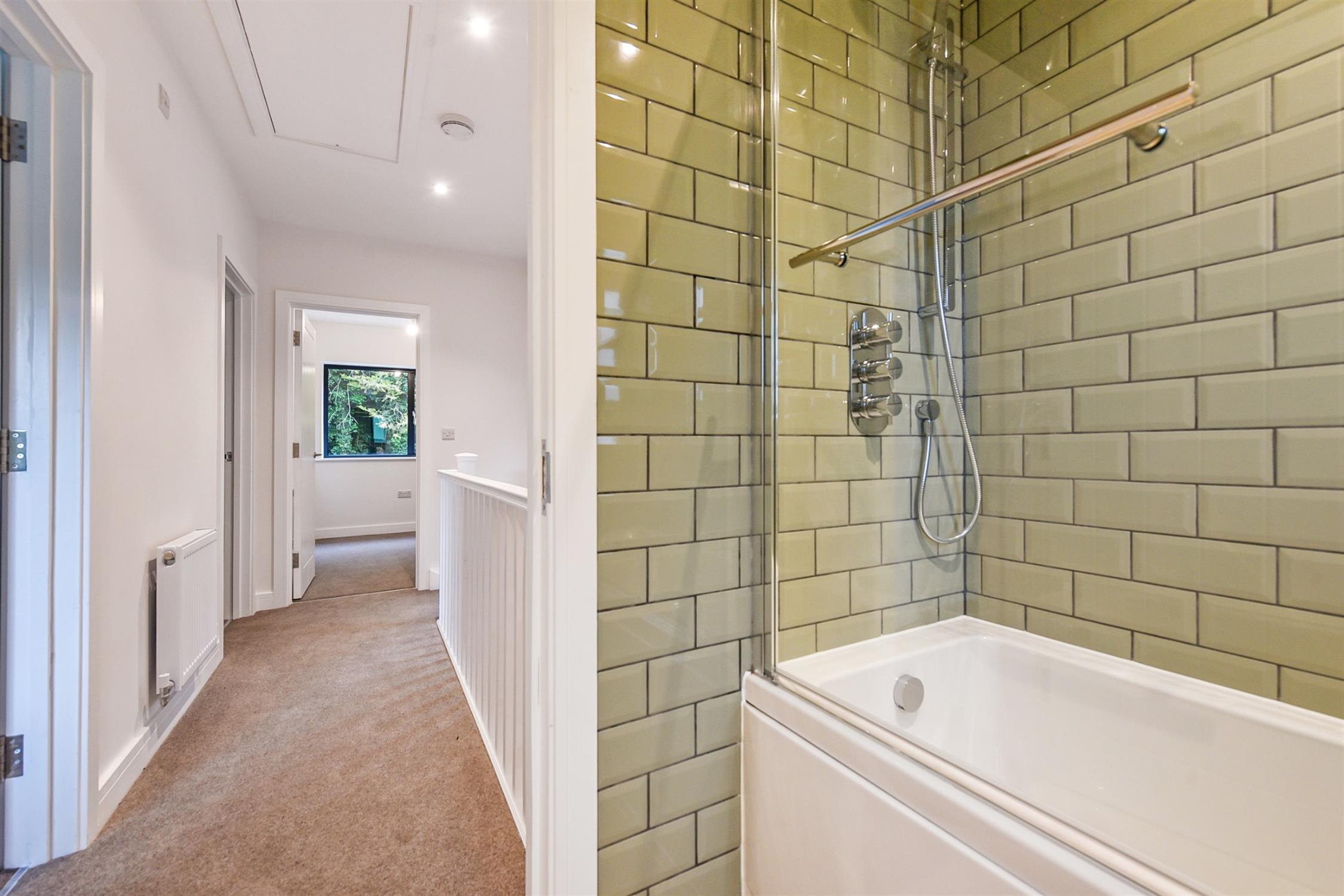 Upstairs, there are three bedrooms and a bathroom. Both bedroom one and two are doubles, and bedroom one also offers an ensuite fitted with waterfall shower, toilet, handbasin, and heated towel rail. The family bathroom is a white suite and is fitted with shower over bath, toilet, vanity unit, and a full-length heated towel rail.