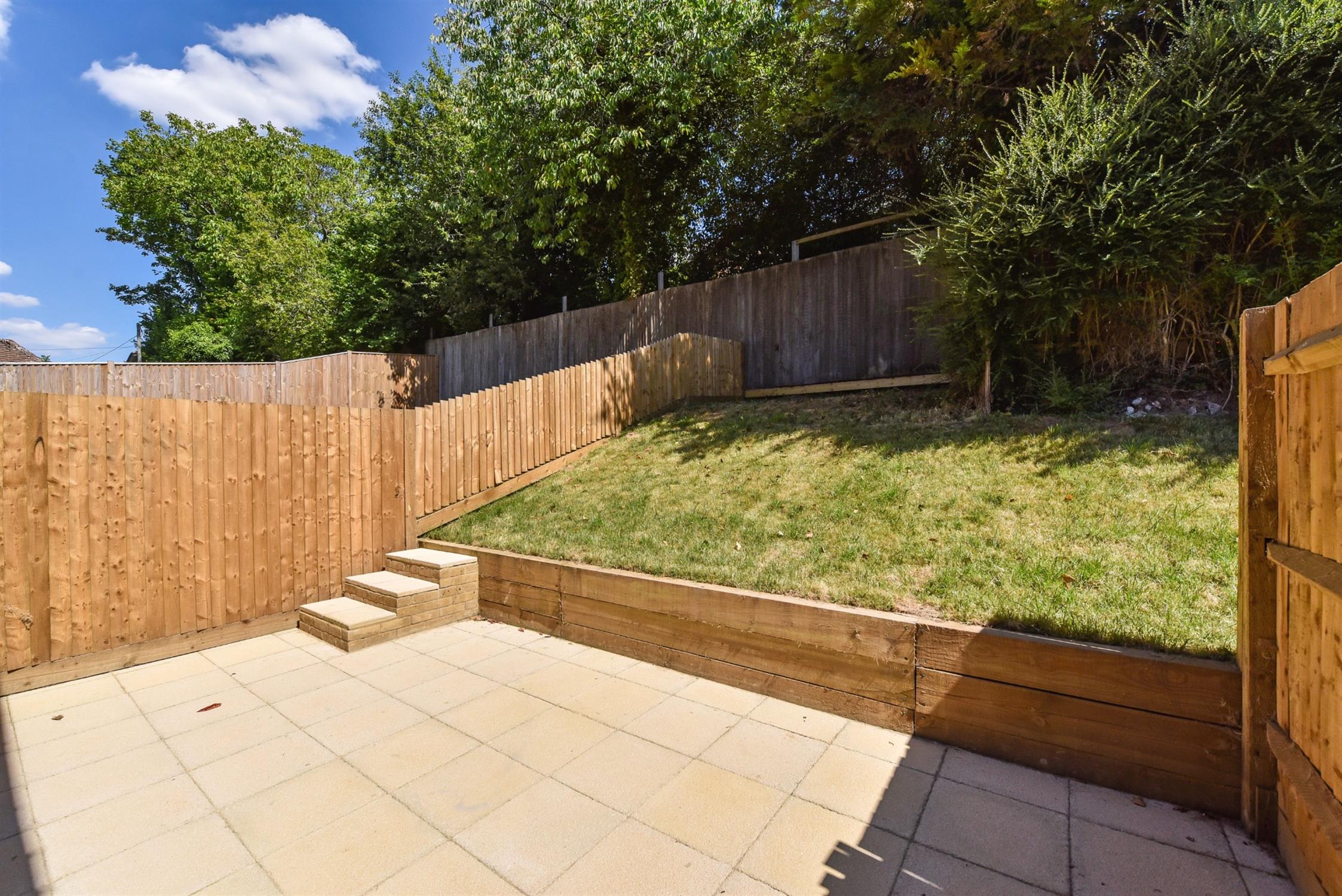 Outside, the enclosed rear garden can be accessed via the kitchen. It offers a patio seating area and steps rise to the lawn bordered by attractive timber sleepers. The property further offers two private parking spaces and side access to the garden.