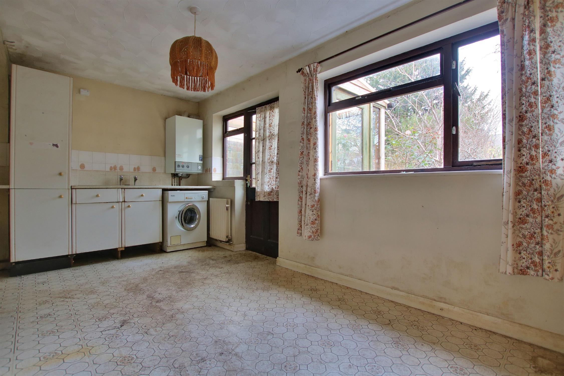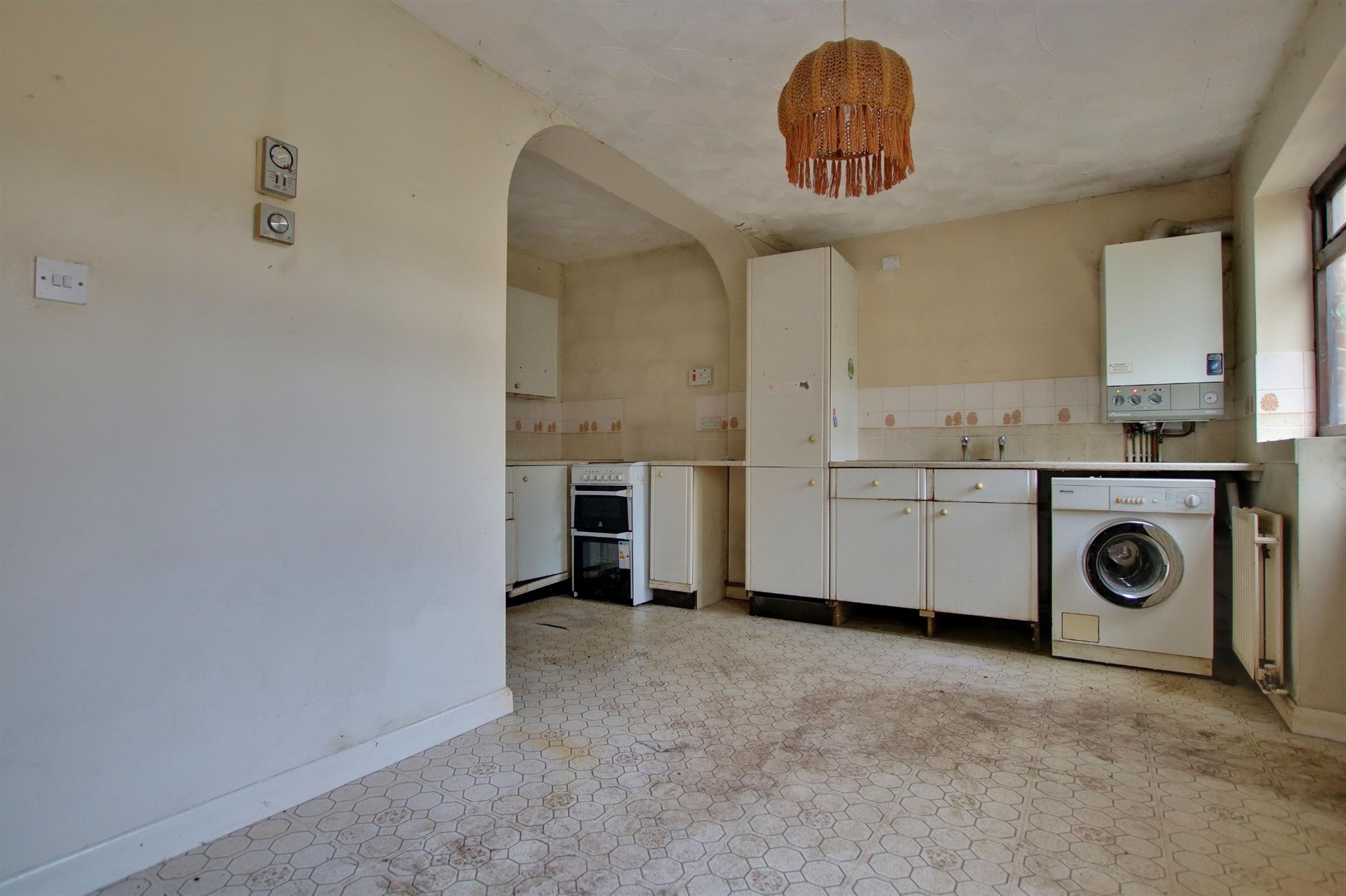 Vinyl flooring. Matching wall and base units. Worcester combi boiler. Electric oven. Washing machine, Single glazed window to rear. Door leading to lean to. Smooth walls and textured ceiling.