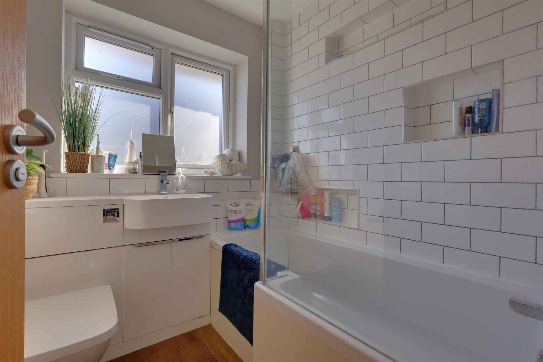 P-shaped bath with screen and shower attachment. WC. Inset sink with cupboard under. Wooden flooring. Extractor fan. Frosted double glazed window.
