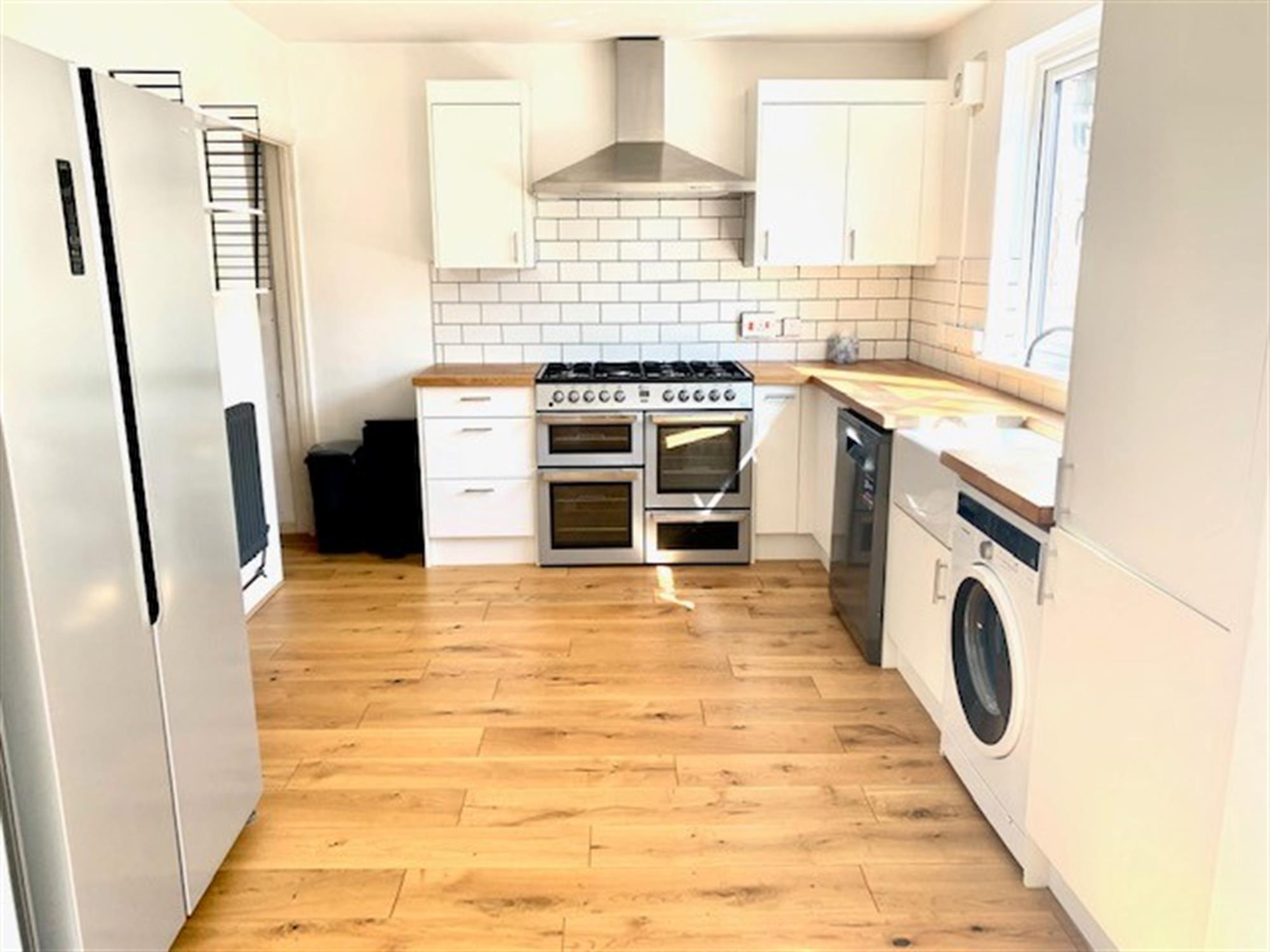 Modern wall and base units. Window to rear. Appliances include: Fridge/freezer, washing machine, gas range oven and dishwasher. Wood flooring.