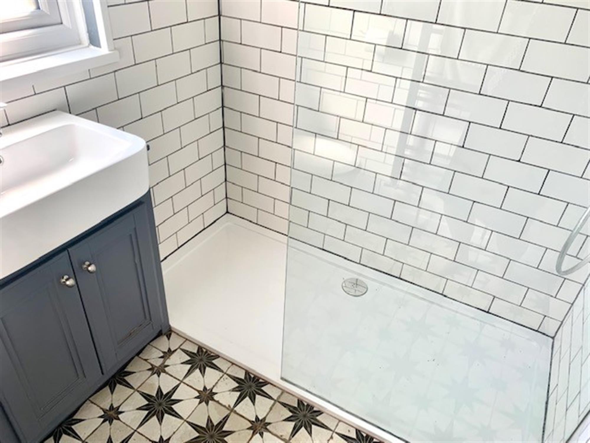 White suite with sink with vanity below, toilet and double width walk in shower. Window to rear.