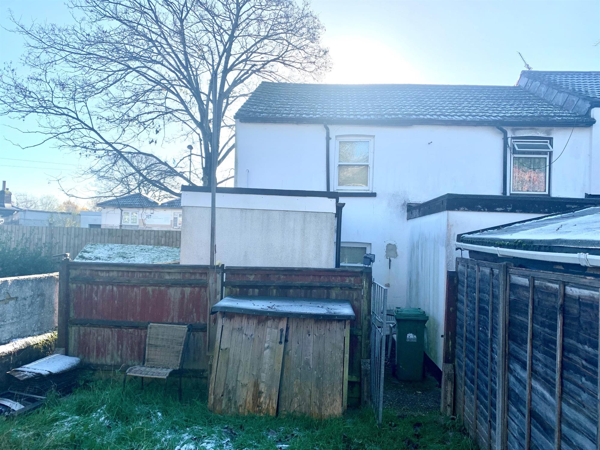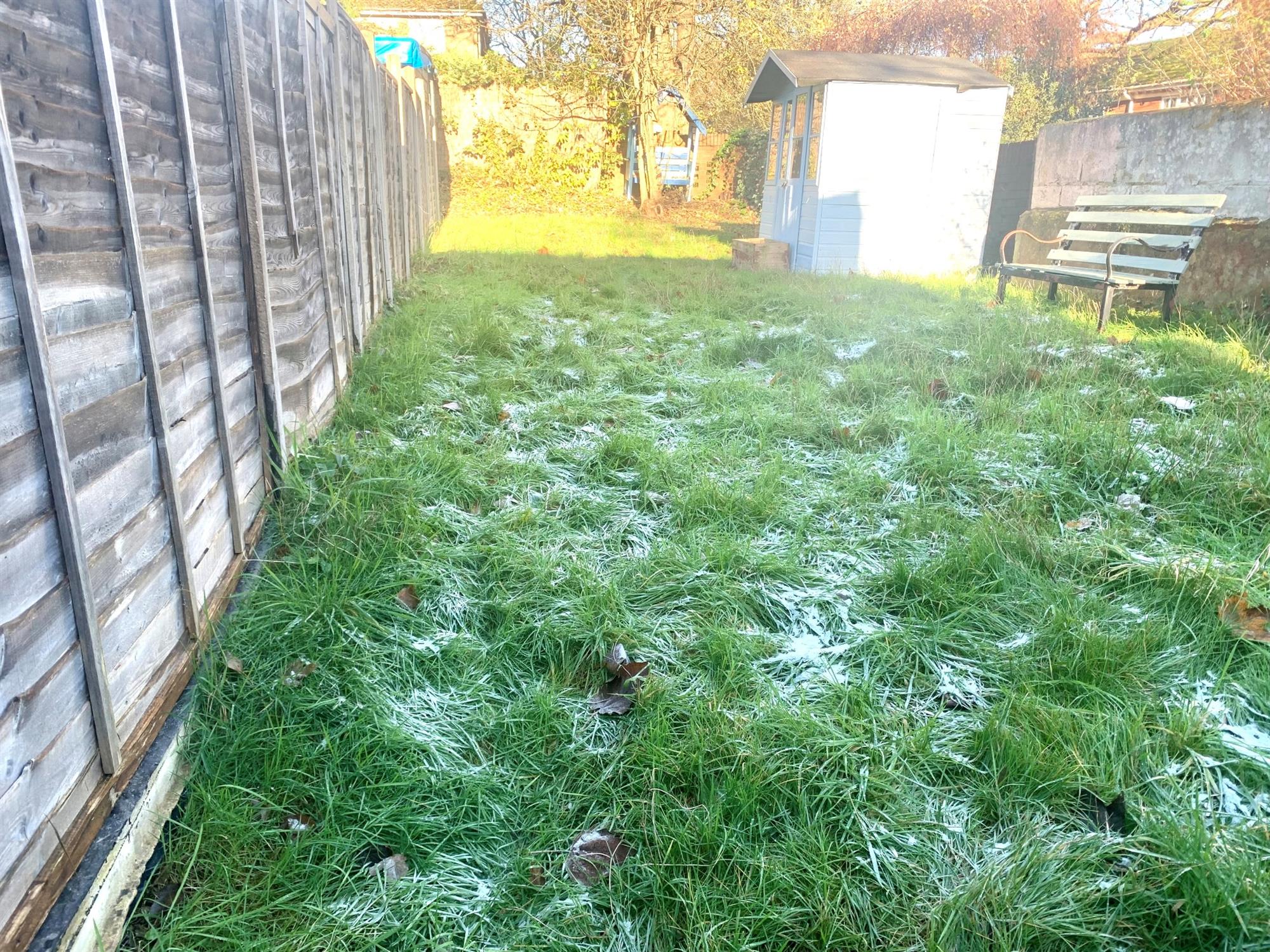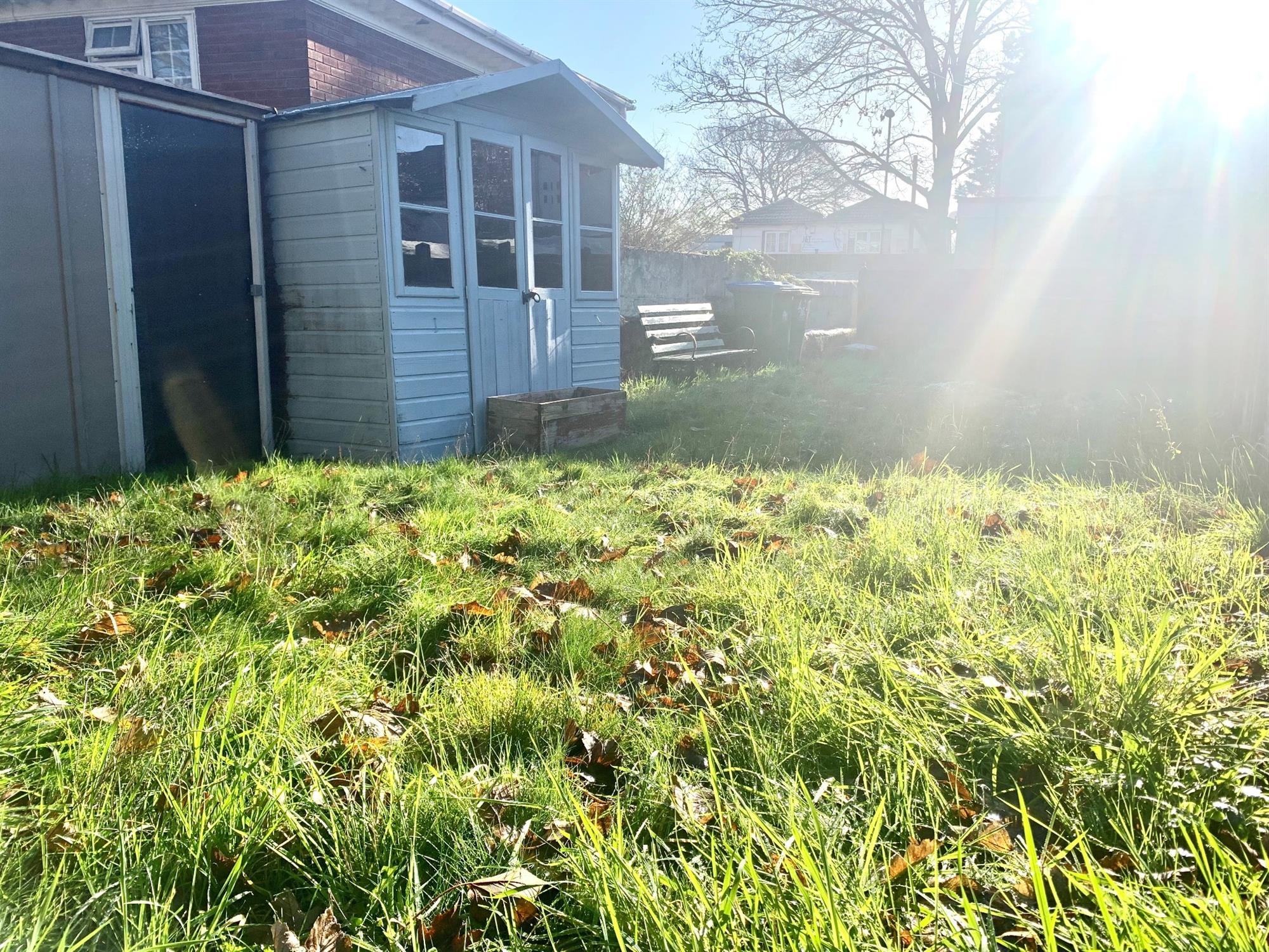 REAR GARDEN – Laid to lawn with shed and several storage units.