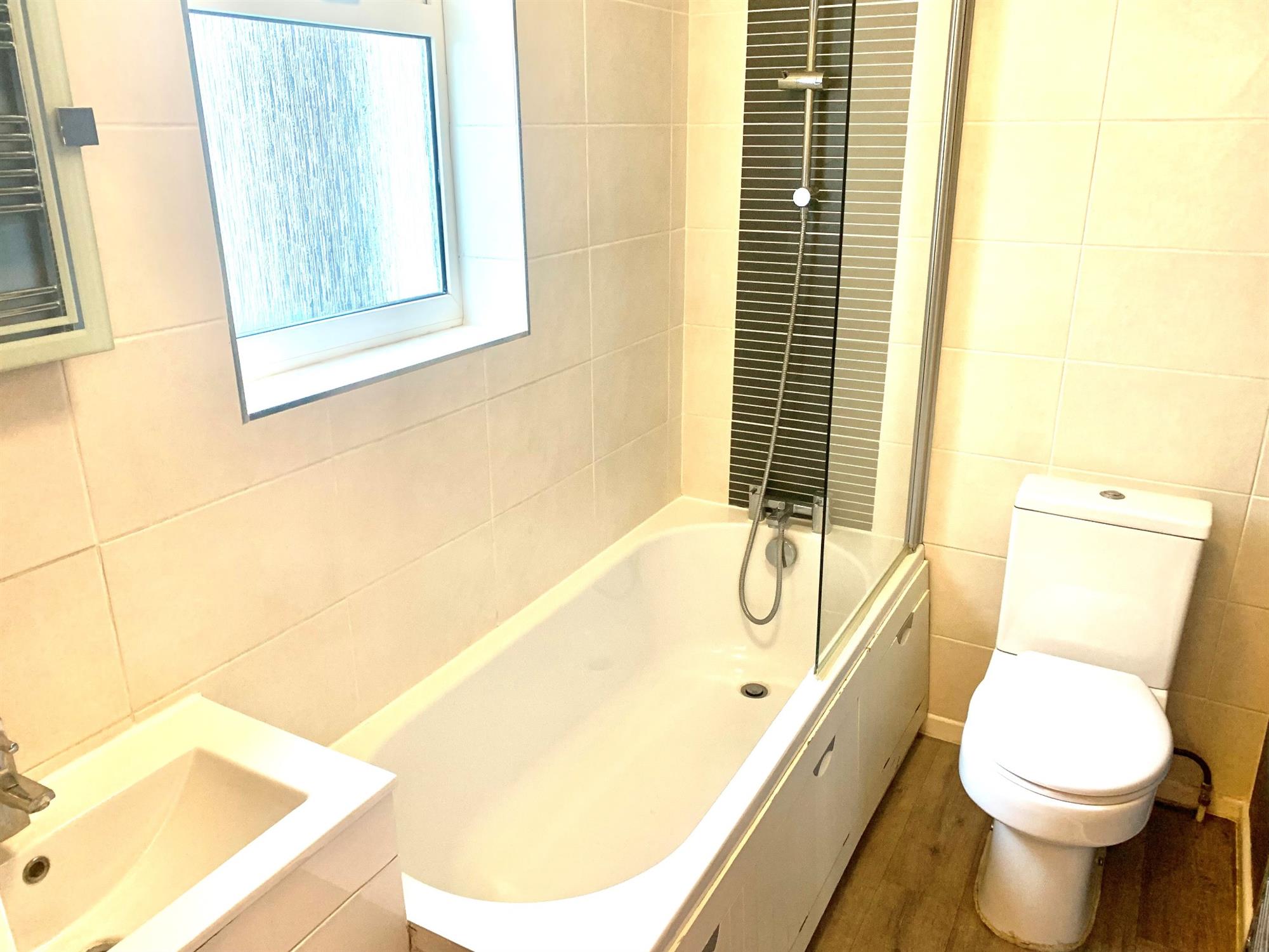 BATHROOM (ground floor) – White suite bathroom with bath with shower over, basin with vanity cupboard and toilet. Window to back.