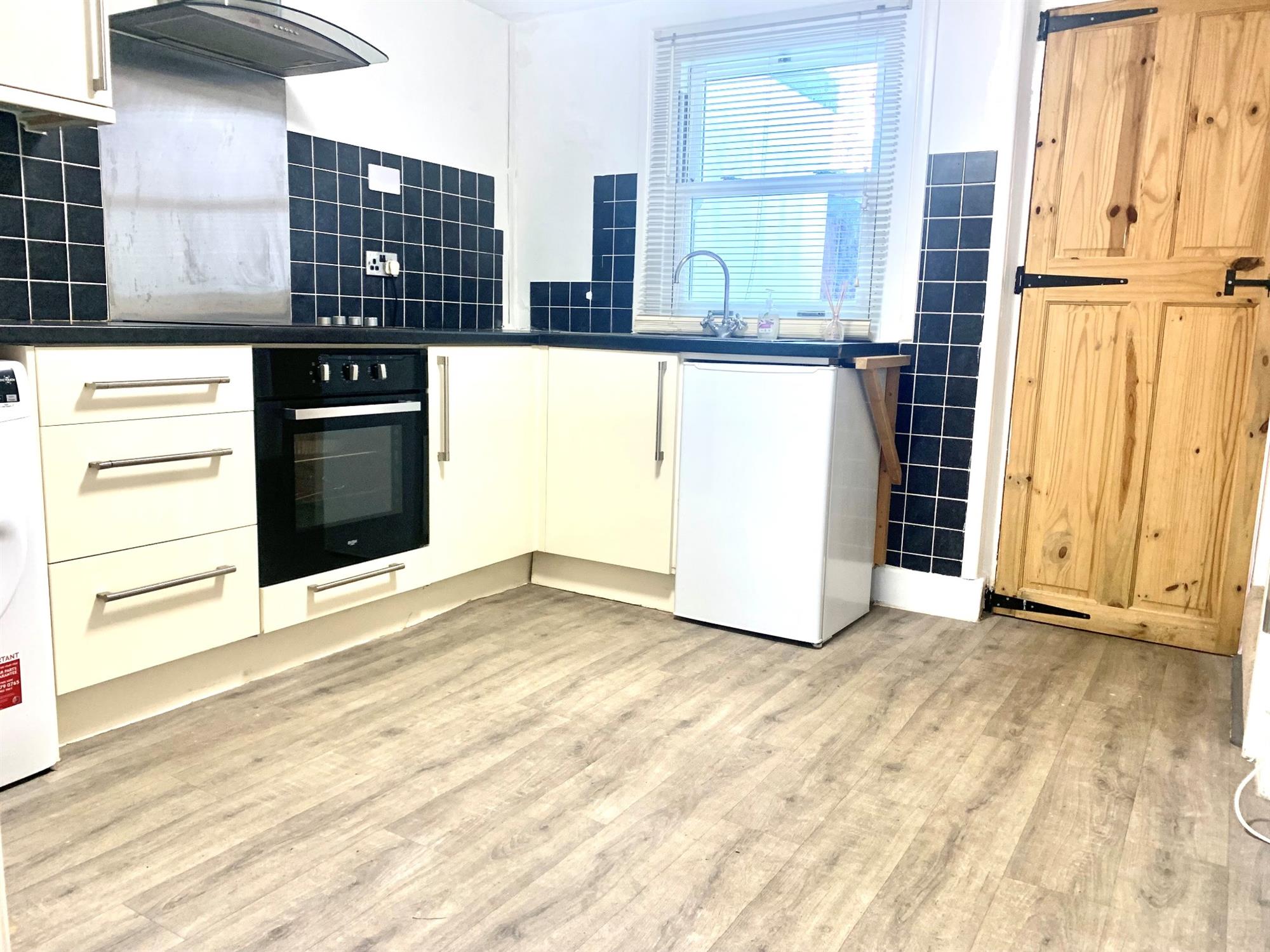 KITCHEN/BREAKFAST – Modern wall and base units with electric hob, electric oven, undercounter fridge, undercounter freezer and washing machine. Window to rear.