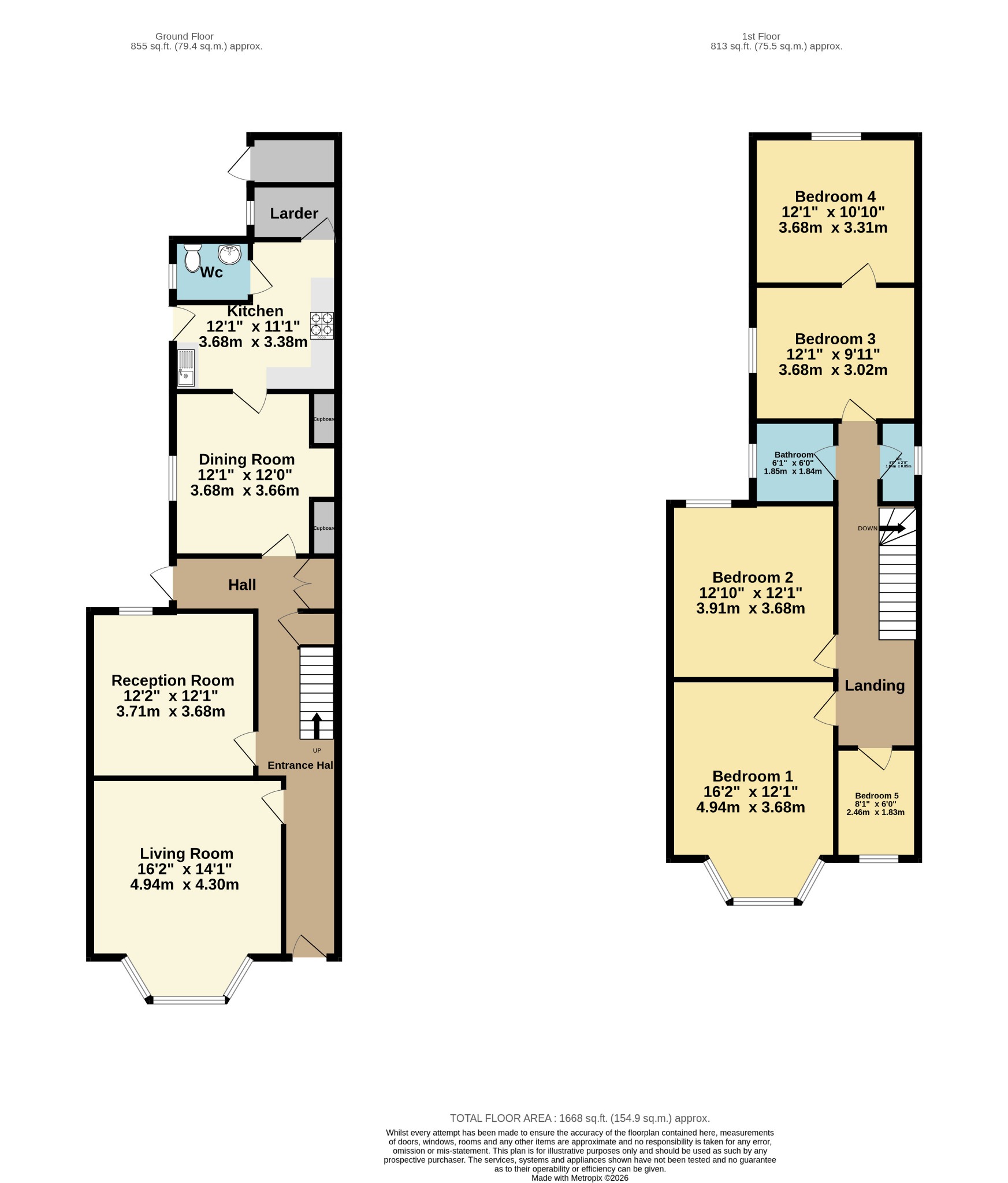 The kitchen is located to the rear of the property with W.C and larder. There are five bedrooms to the first floor with bedrooms three and four being inter-connecting. Shower room and a separate W.C. complete the first floor accommodation. Gas central heating. Externally, a well proportioned walled rear garden mainly laid to lawn and small walled front garden. On street parking.