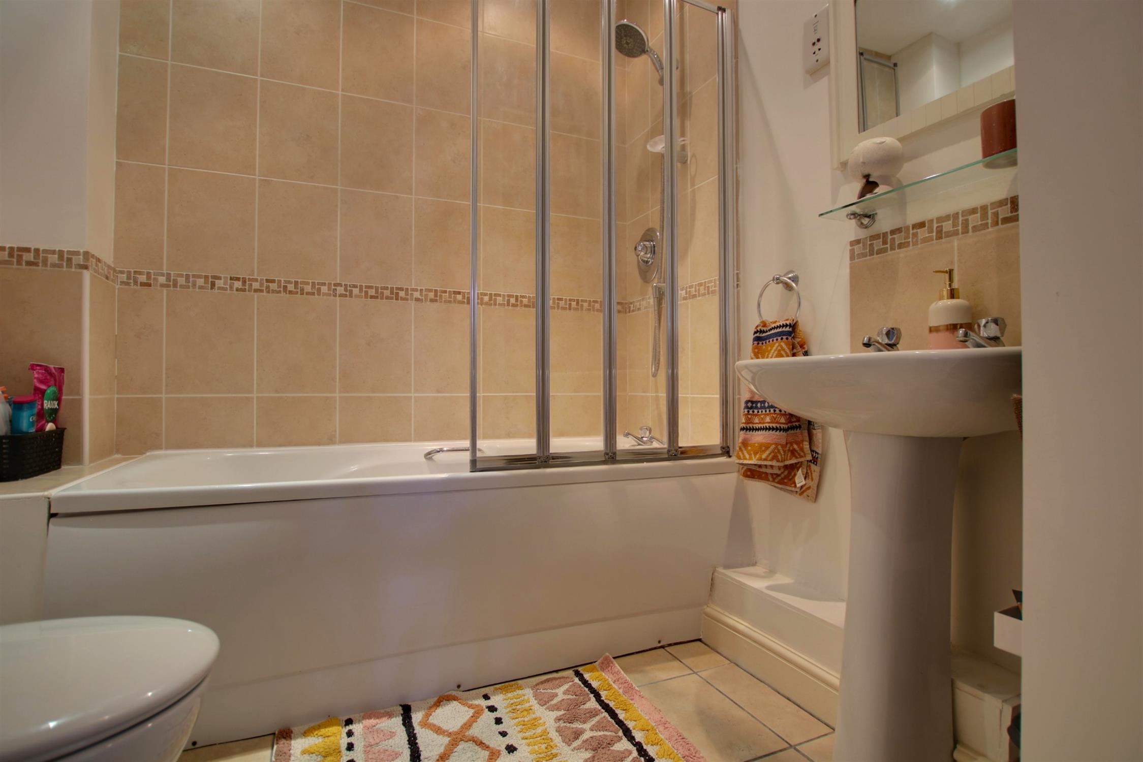 Complementary tiled walls and flooring. Panelled bath with thermostatic shower over, ceramic wash basin and w.c. Smooth walls and ceiling with inset spotlight. Extractor fan. Radiator.
