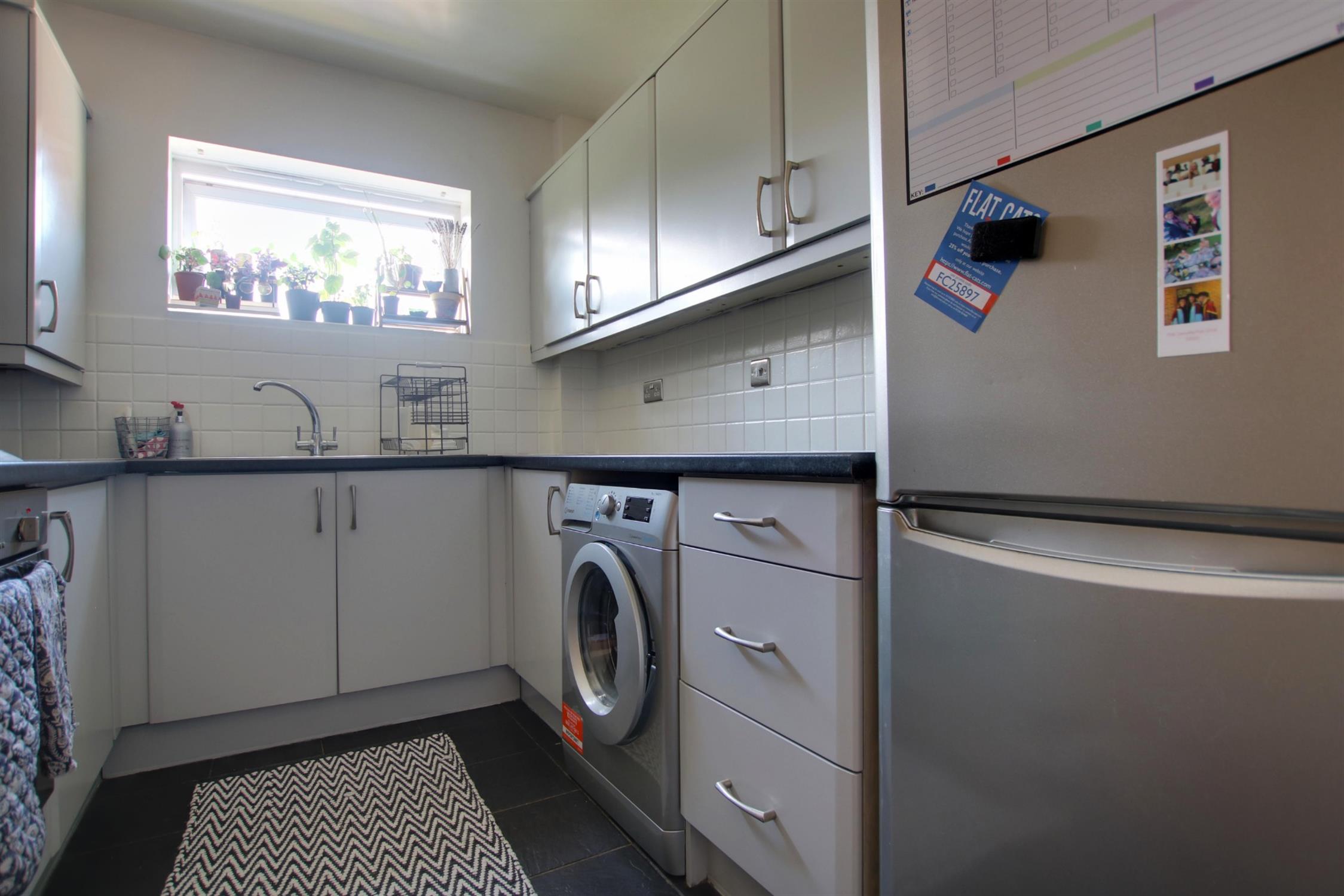 Slate effect tiled flooring. Matching wall and base units with worktop over. Glow Worm combination boiler within cupboard. Space for tall standing fridge/freezer and washing machine.
