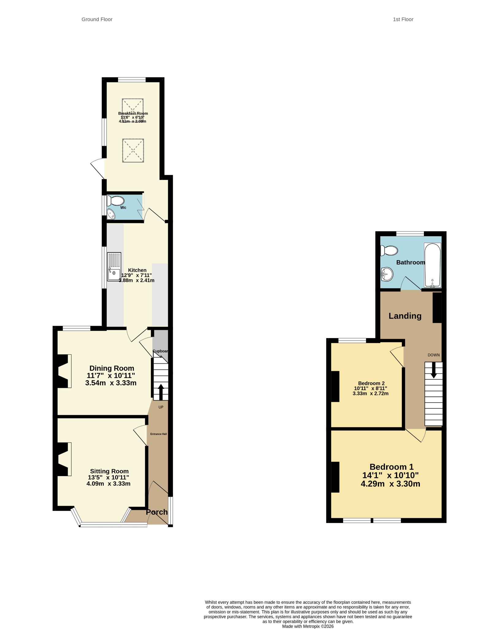 Double glazed obscure glass window to rear aspect. Panel enclosed bath with mixer tap and shower over, wash basin and low level flush w.c. Heated towel rail. Tiled walls.