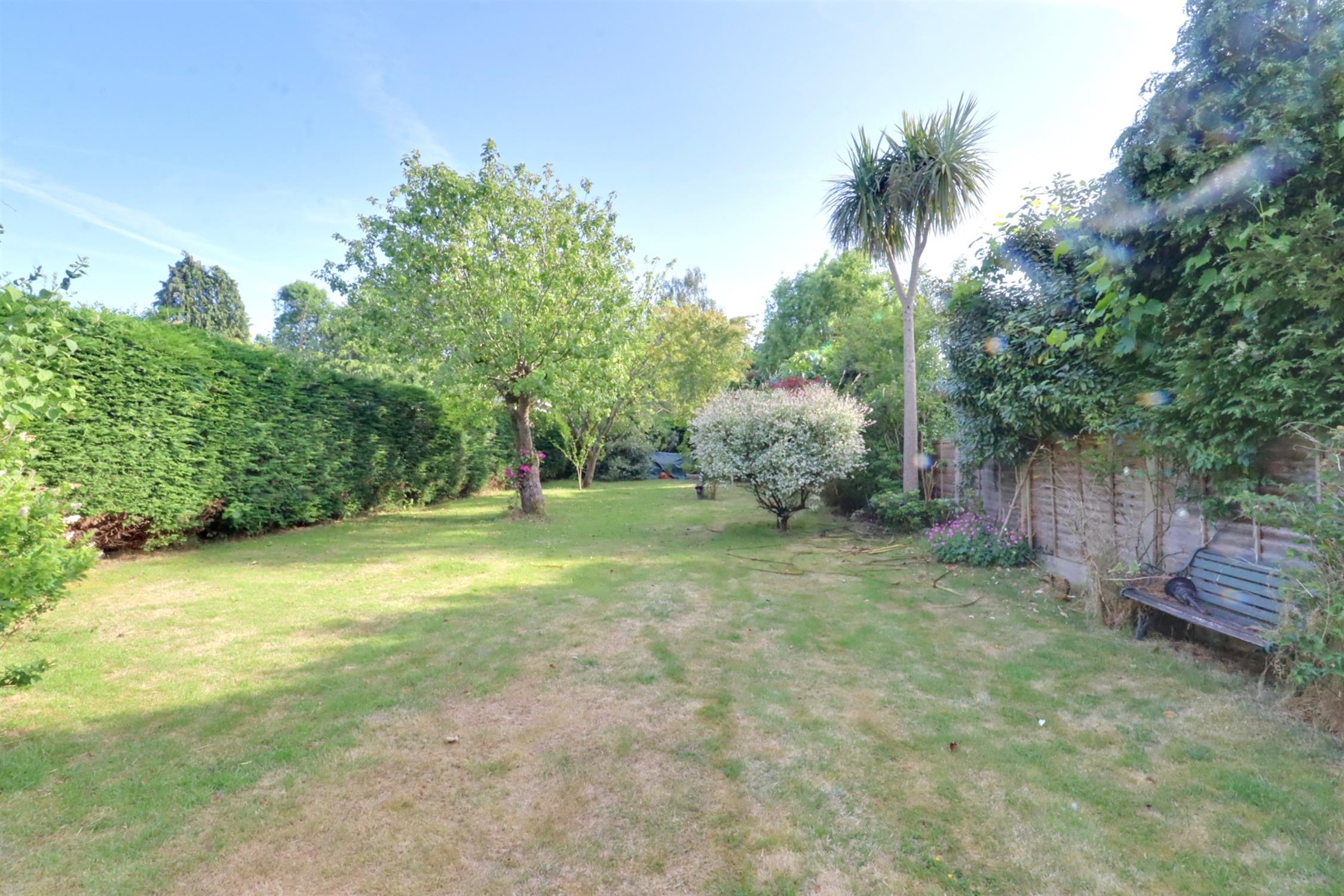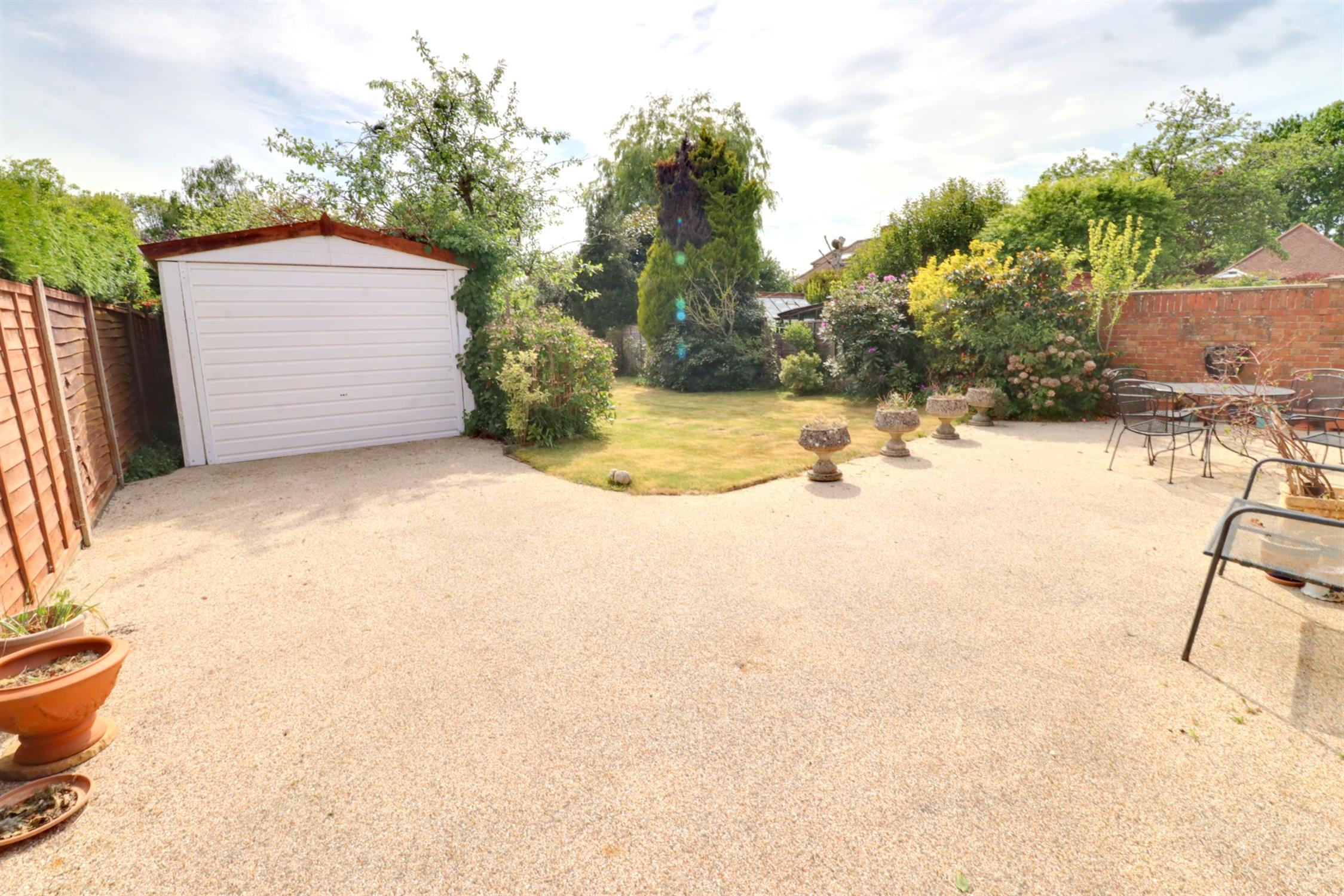 Large, private and timber fence panel enclosed, additional resin patio and seating area with access to detached garage with ‘up and over’ door, windows and personal door to side. The garden is predominantly laid to lawn with mature trees and flowering shrub borders, hedgerow, greenhouse.