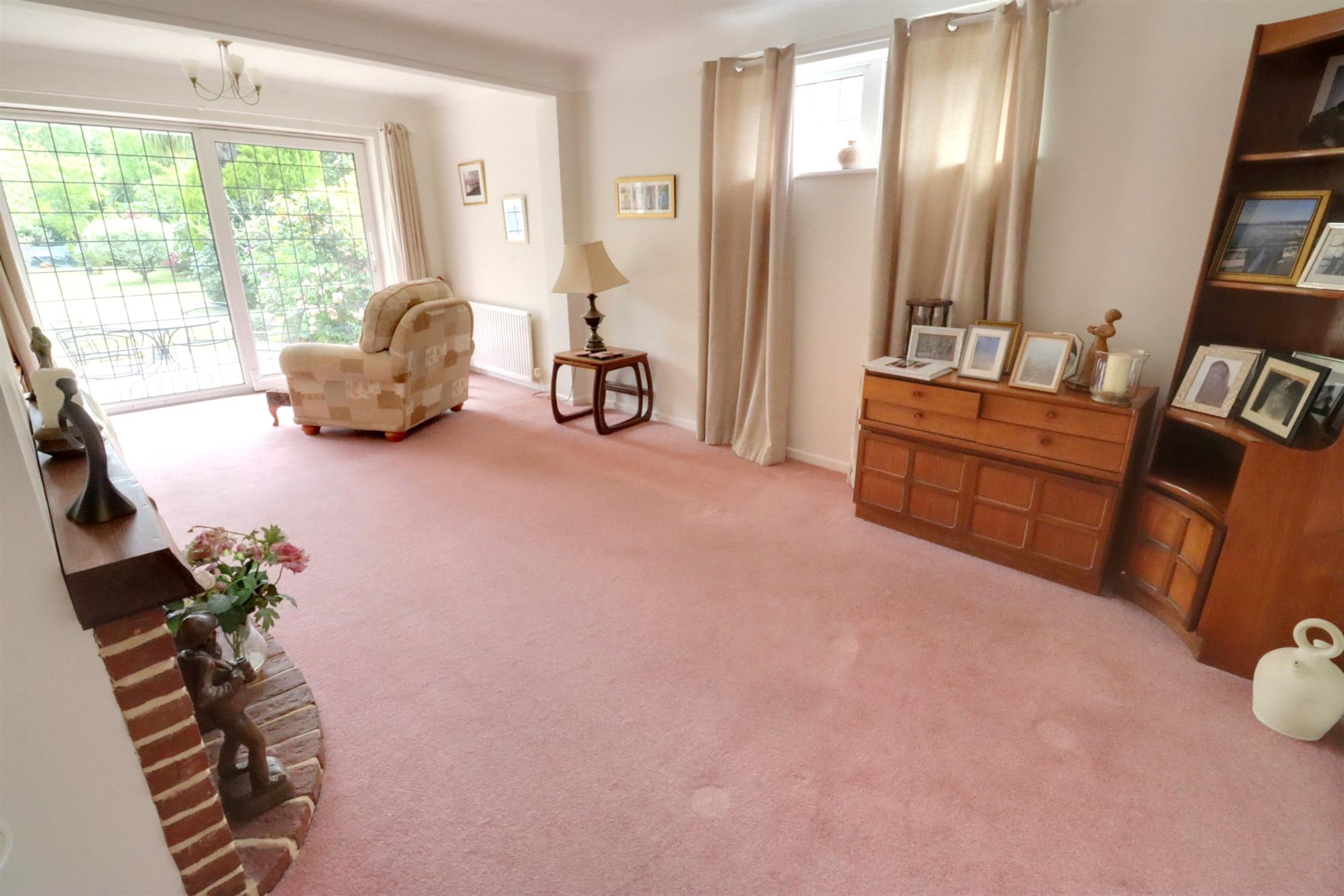 Lead light double glazed sliding patio doors to rear garden, lead light double glazed window to side, two radiators, chimney breast with inset gas fire, timber mantle and brick surround and hearth.