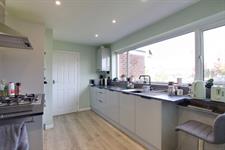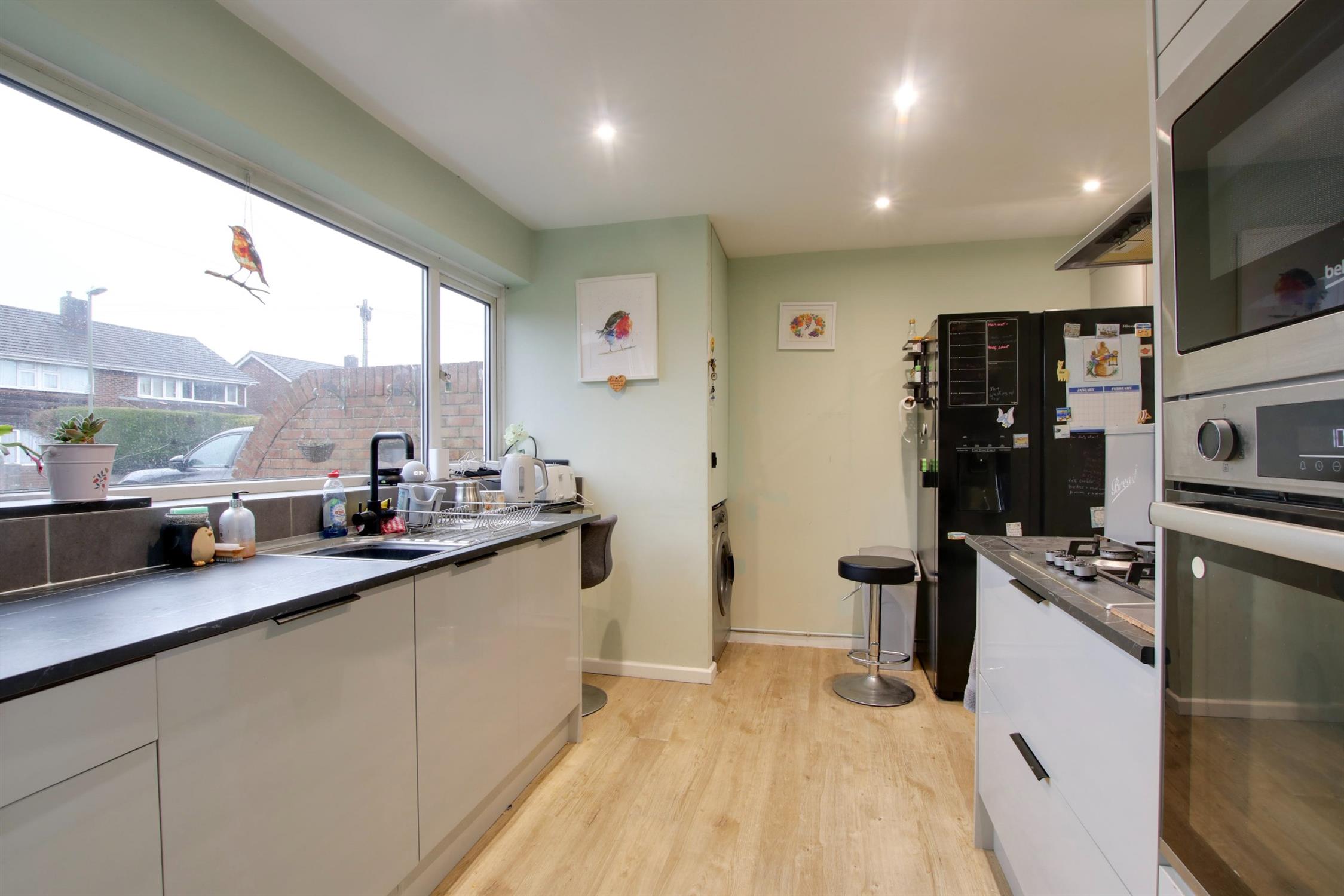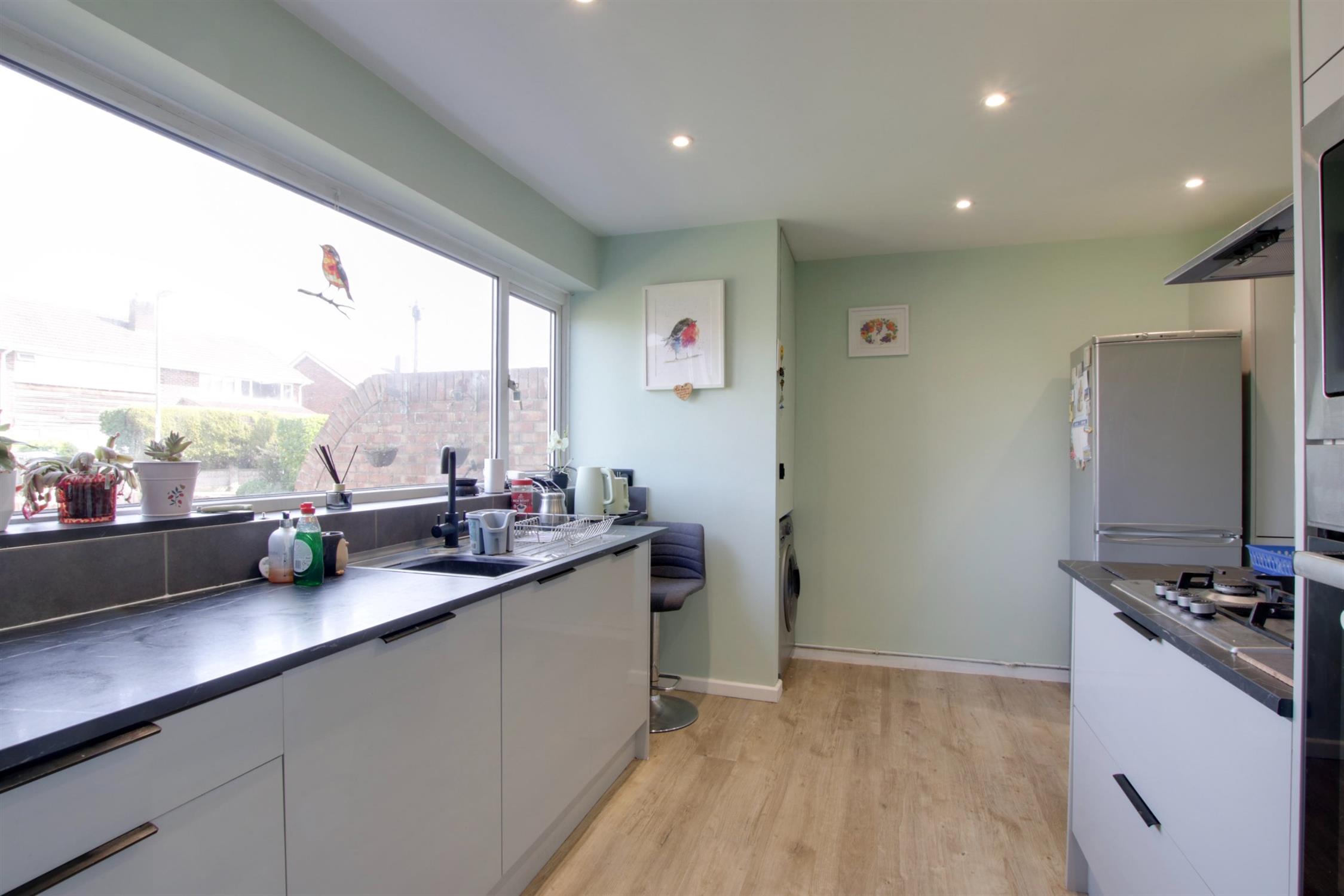 Double glazed window to front elevation. Stainless steel single drainer sink unit with cupboard under. Further range of wall and base level units with work surfaces over and splashback tiling. Built-in four ring gas hob with cooker hood over. Built-in oven and microwave with cupboards under and over. Recess for fridge/freezer. Plumbing for washing machine. Understairs storage cupboard. Cupboard housing wall mounted gas boiler. Vertical radiator.