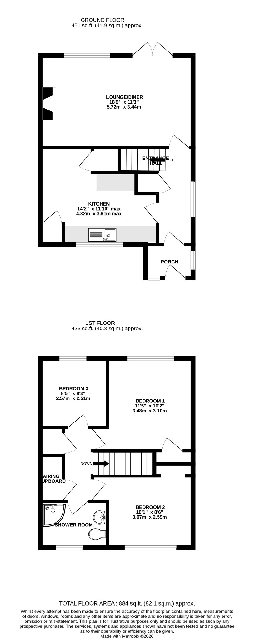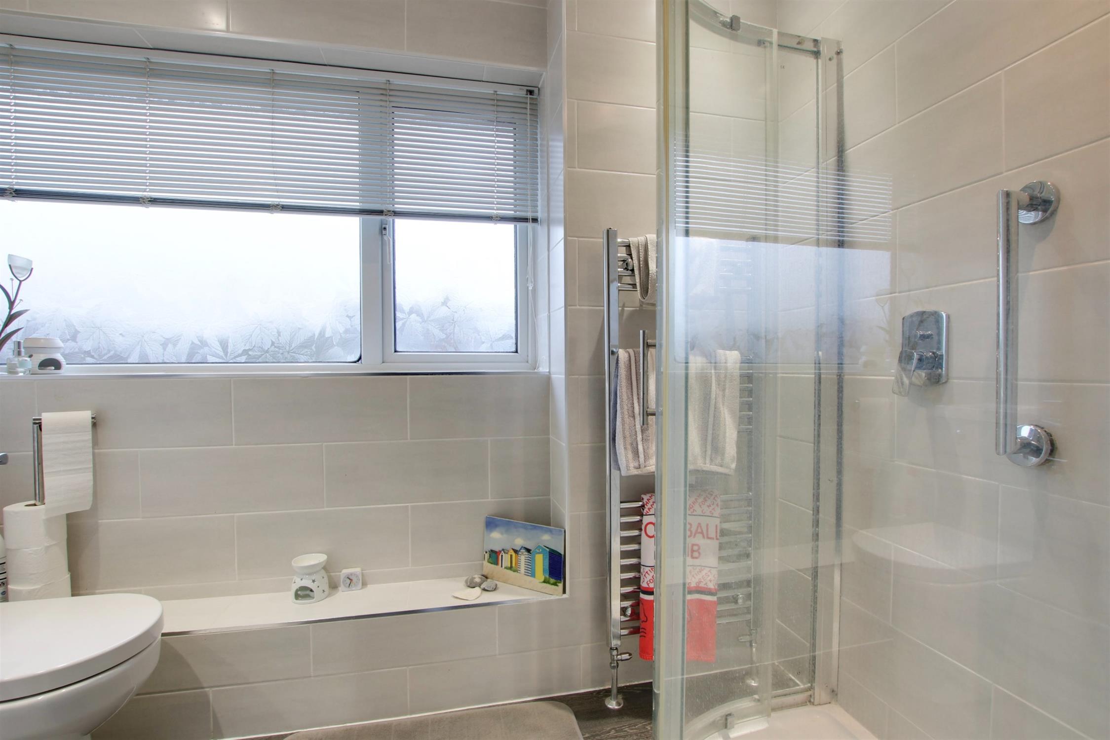 Double glazed window to front elevation. Quadrant shower cubicle with monsoon shower head. Vanity unit with wash hand basin and storage beneath. Low level close coupled WC. Wall mounted bathroom cabinets. Heated chrome towel rail. Tiled walls. Inset ceiling spotlights. Laminate flooring.