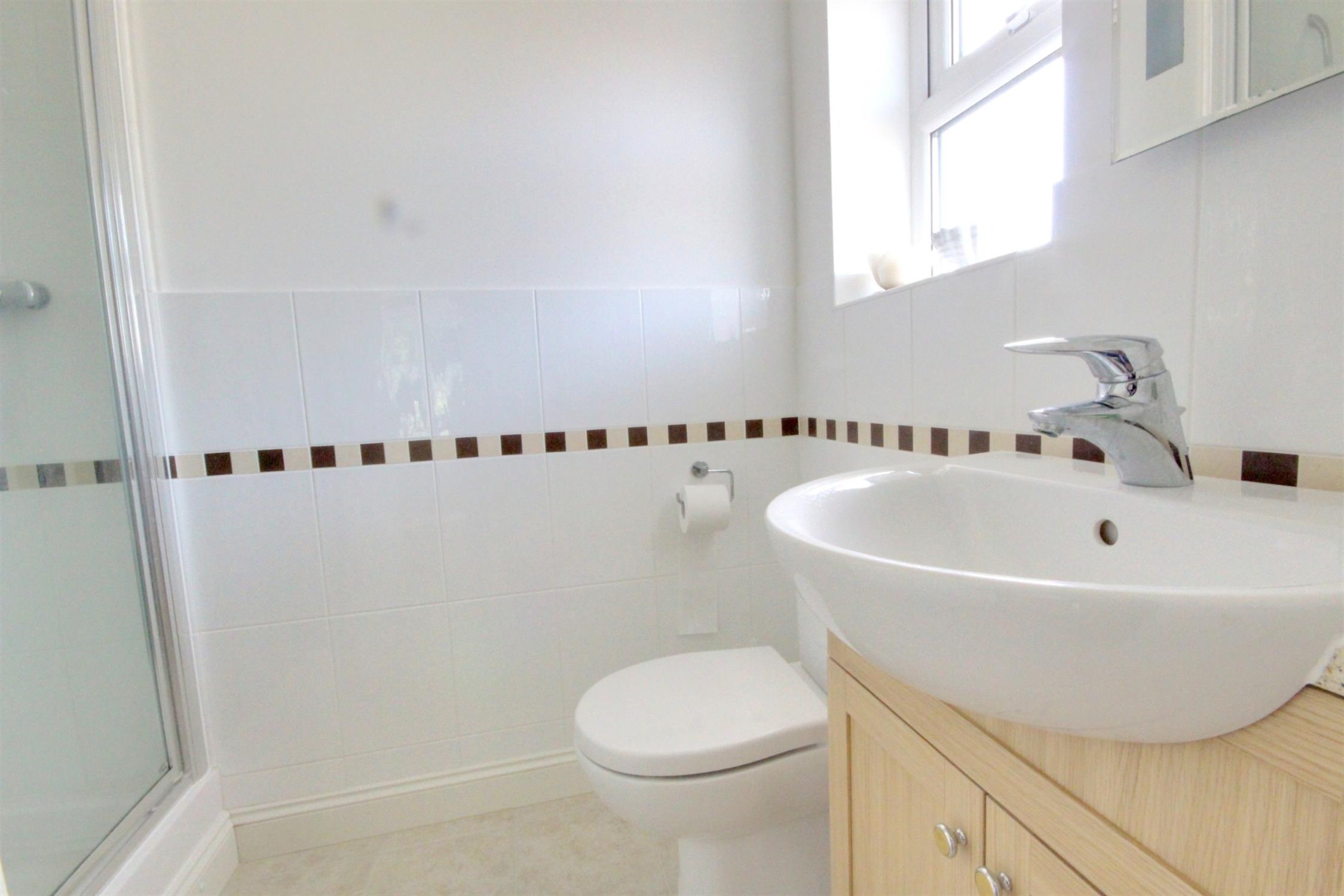 Shower cubicle with tiled walls and shower, low level WC, vanity unit with storage under, radiator, extractor fan, side aspect double glazed obscured window.