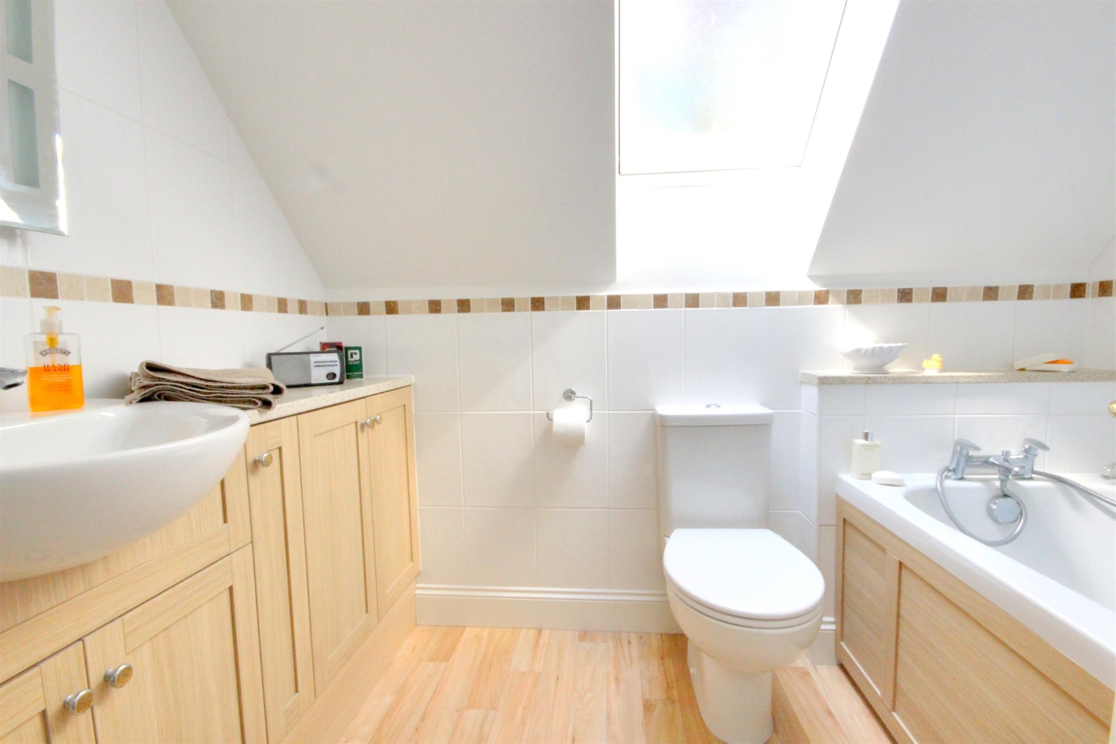 Panel enclosed bath with shower attachment, low level WC, vanity unit with storage under, radiator, tiled walls, side aspect double glazed Velux style window.