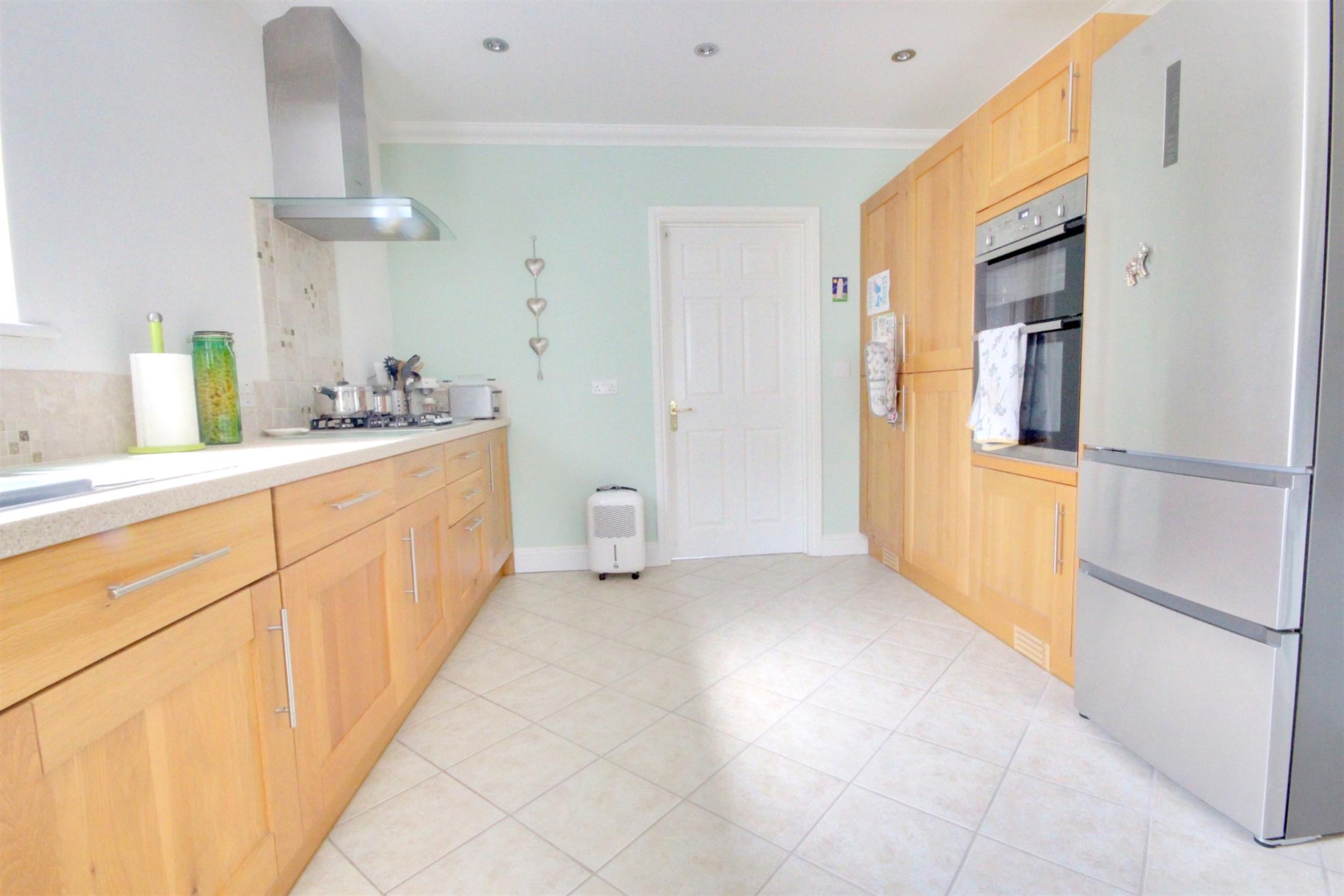 Fitted with a range of matching wall and base units with work surfaces over, integral electric double oven and gas hob with extractor hood over, integral dishwasher, stainless steel one and a half bowl sink, radiator, tiled floor, front aspect double glazed window and side aspect double glazed obscured window, coved ceiling with sunken spotlights, door to the utility room.