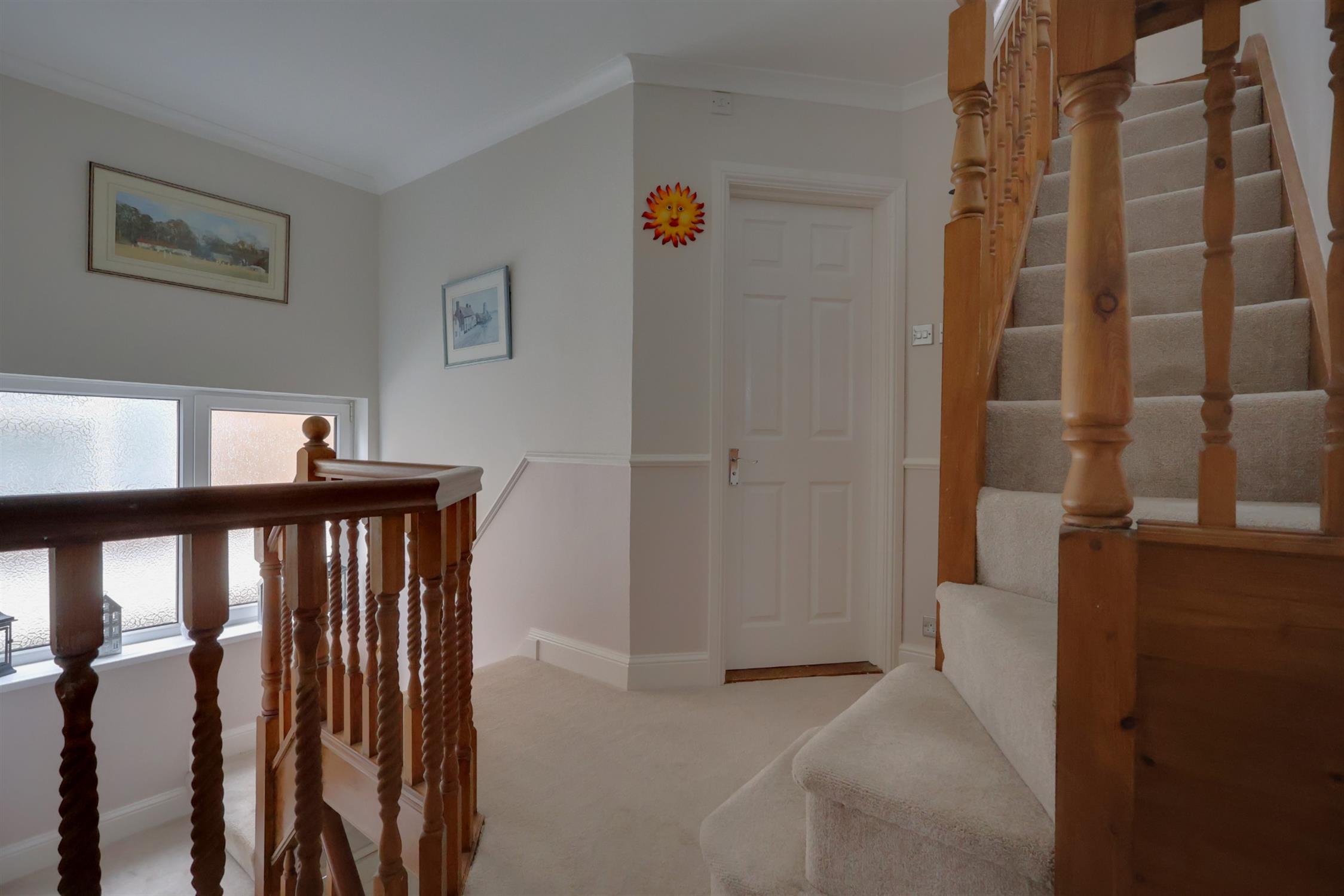 Obscure double glazed window to side elevation. Doors leading to first floor rooms. Stairs rising to second floor. Radiator. Under stair cupboard.
