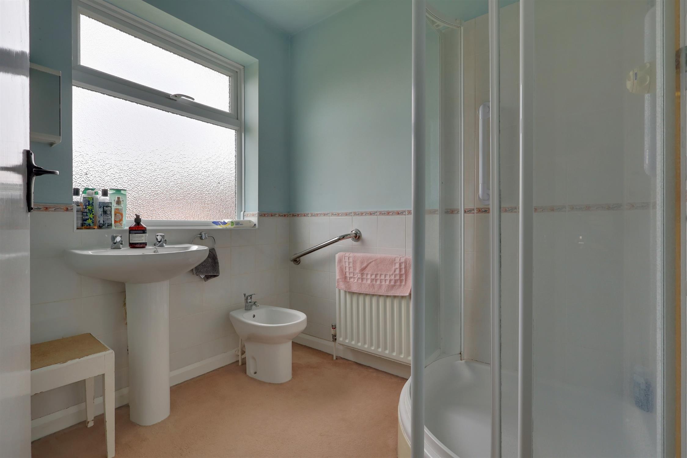 Shower cubicle. Ceramic sink. Bidet. Radiator. Frosted double glazed window.