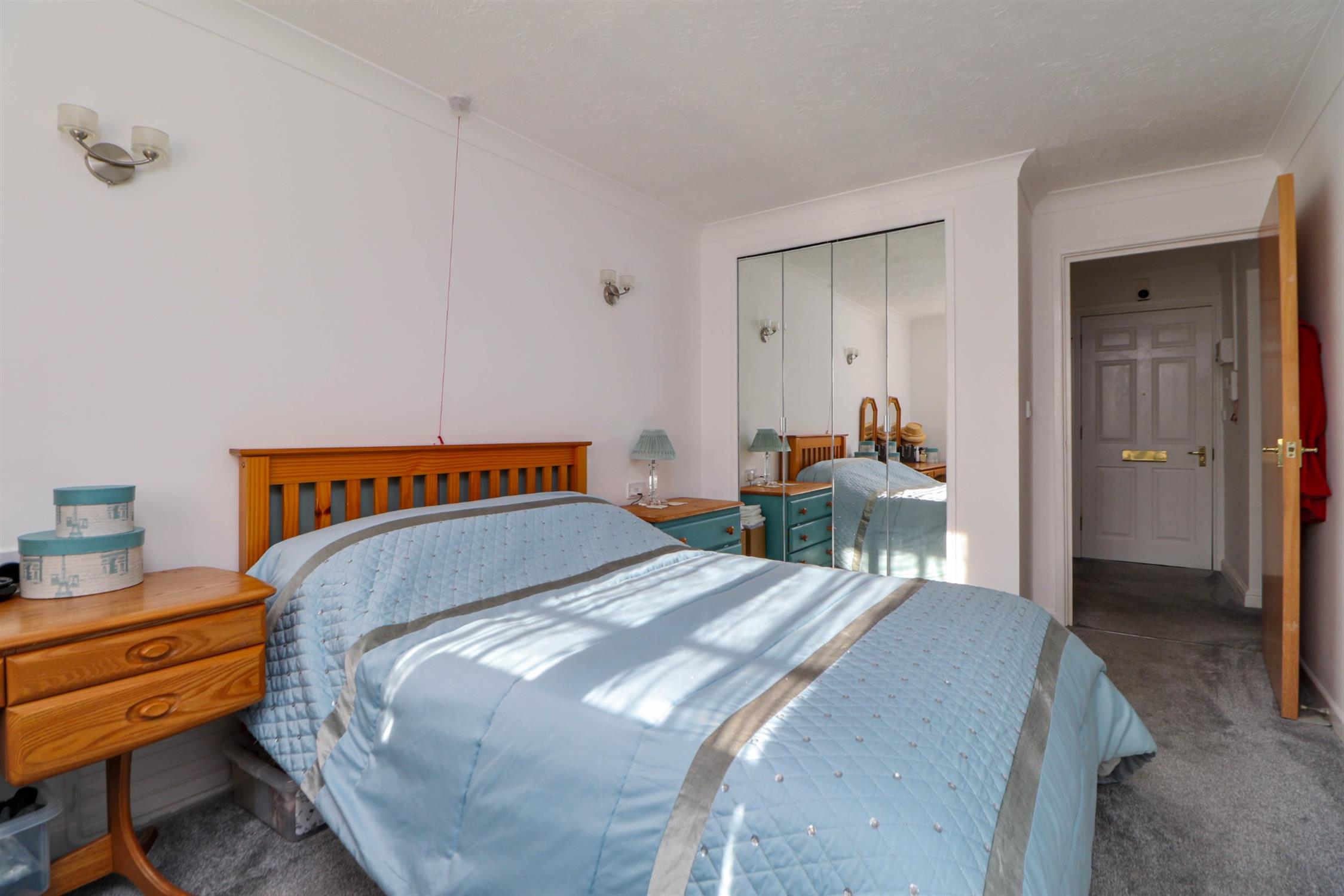 Textured and coved ceiling, UPVC double glazed south facing window with fitted blinds, electric heater, fitted wardrobe with mirrored doors, fitted carpet.