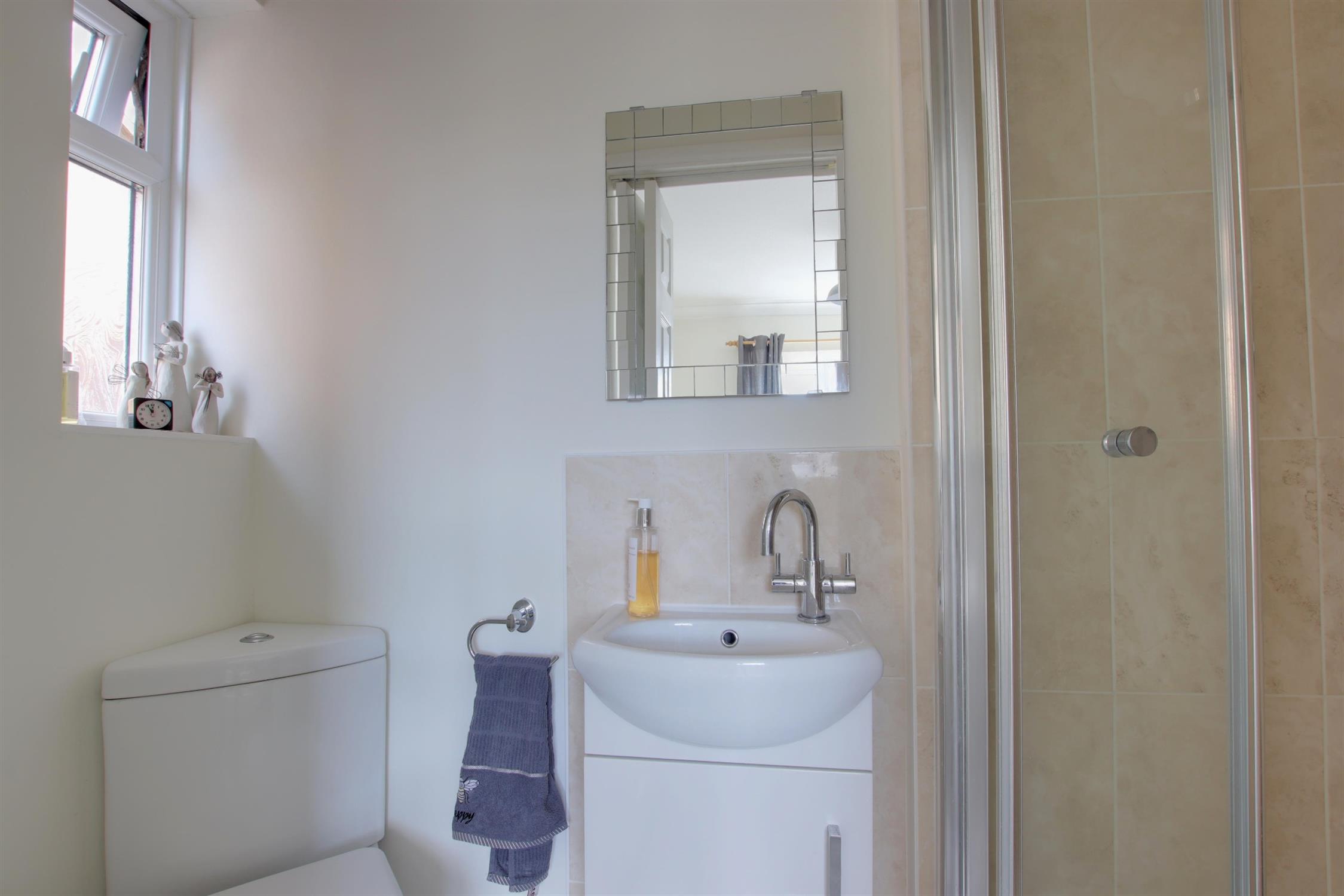 Double glazed obscure window to the side aspect. Smooth ceiling with inset spotlighting. Modern suite comprising; shower cubicle, wash hand basin and low level WC. Part tiled walls. Grey wood effect vinyl flooring.